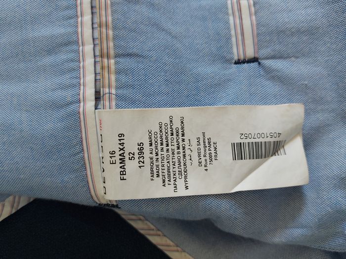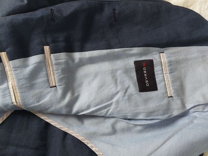 Blazer de couleur bleu de marque Devred, de taille 52, ce qui correspond à un XL, taille petit plutôt L. Très bon état. Je vends d'autres vêtements de toutes tailles homme, femme.