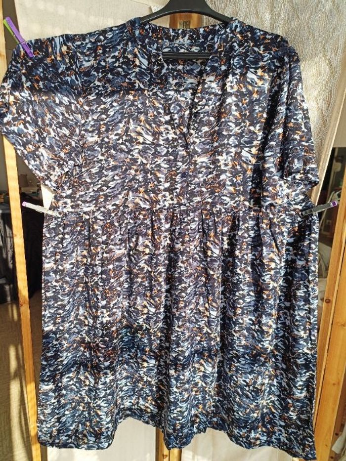 Belle robe fluide , manches courtes .Taille 44 , longueur 95 cm Autres mesures sur photos .