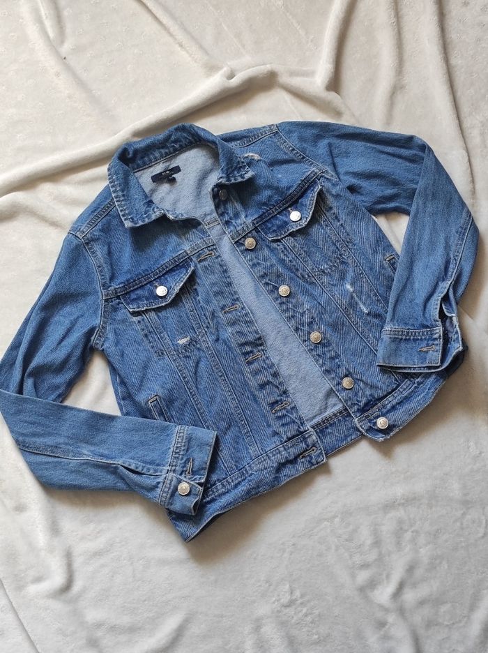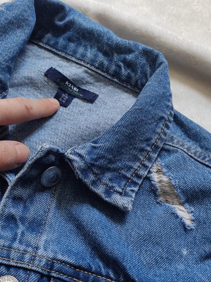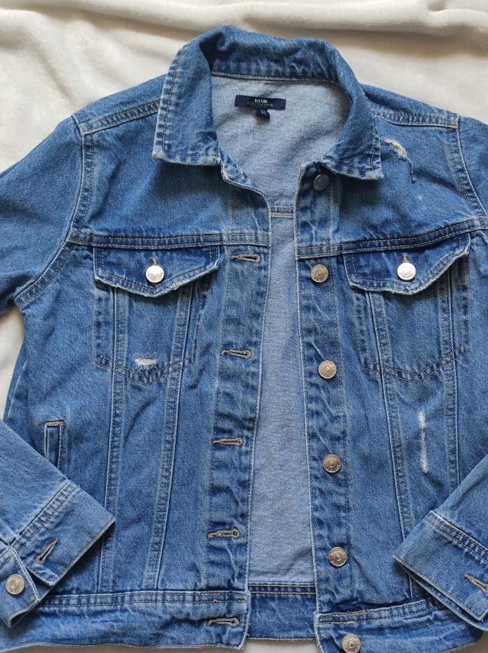 veste en jean effet déchiré, deux poches à la poitrine et sur le côté. Marque Kiabi en taille S. Peu porté en parfait état.