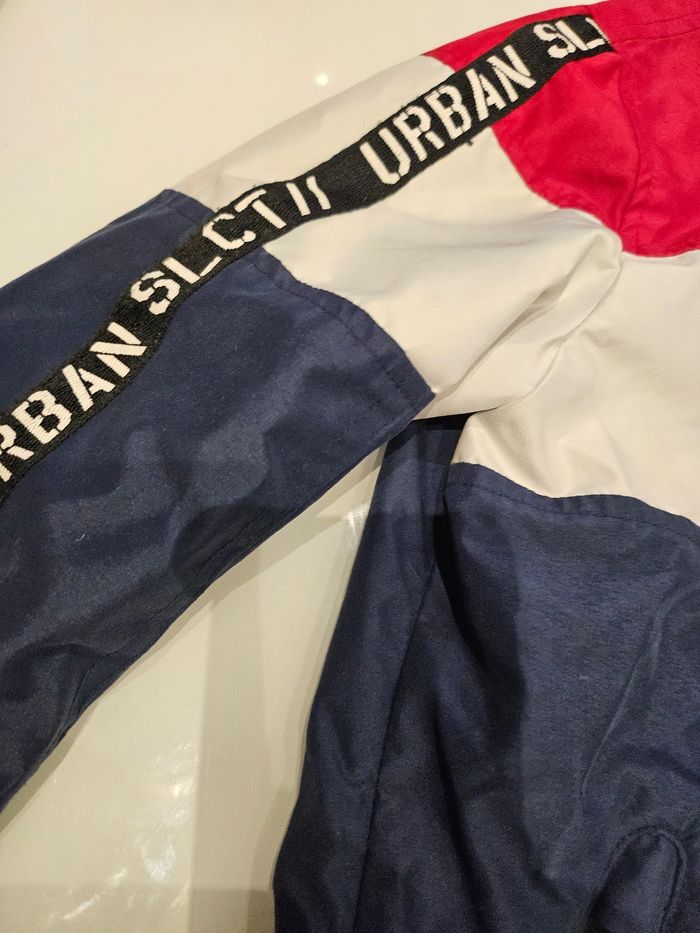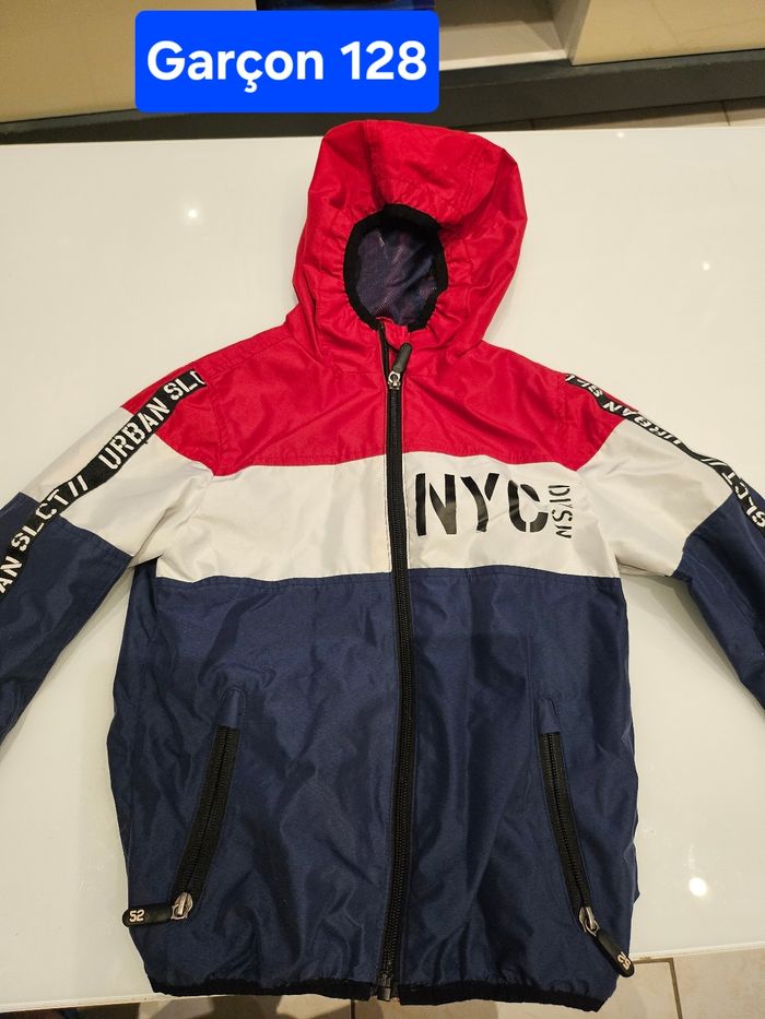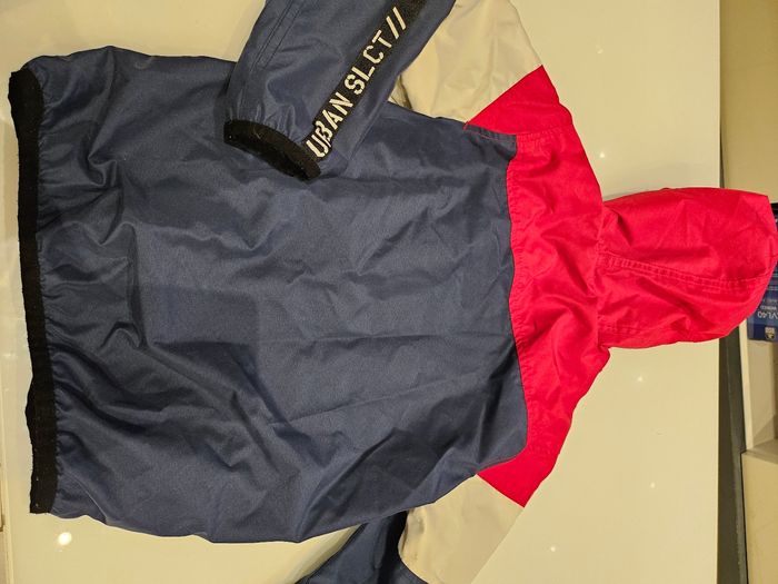 Veste fine imperméable avec capuche. Se ferme par fermeture. Deux poches zippées. Bleu, blanc et rouge. Écritures sur les bras et devant. Marque : Palomino Taille : 128