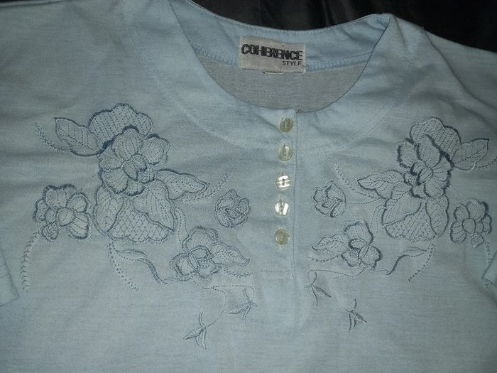 PAS D'ENVOI PAR VINTED GO OU HOMERR T-shirt bleu clair, petite ouverture de chaque côté Taille M/L Bon état, légères bouloches Largeur aisselle à aisselle : environ 55 cm Longueur : environ 71 cm Composition: 65% polyester et 35% coton Envoi rapide et soigné