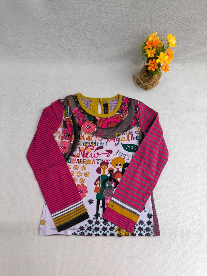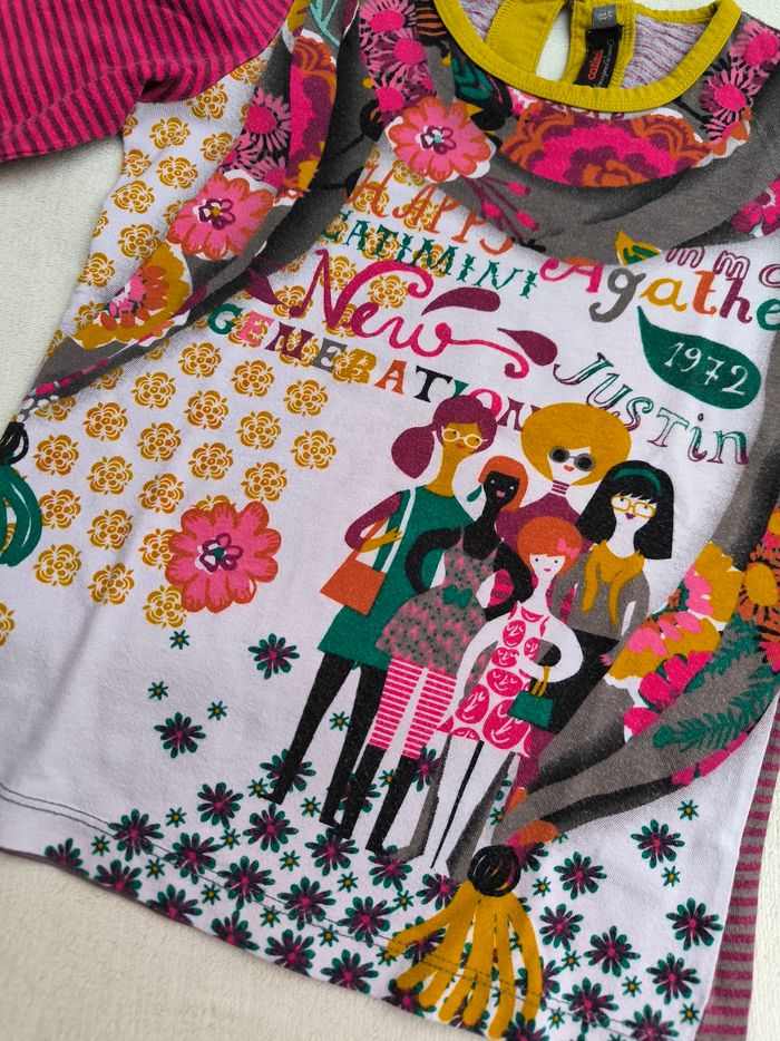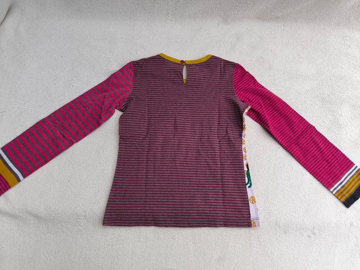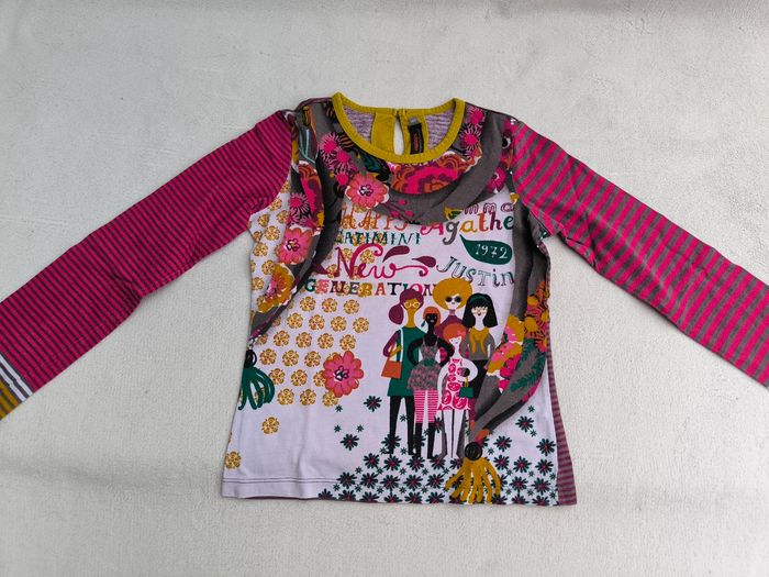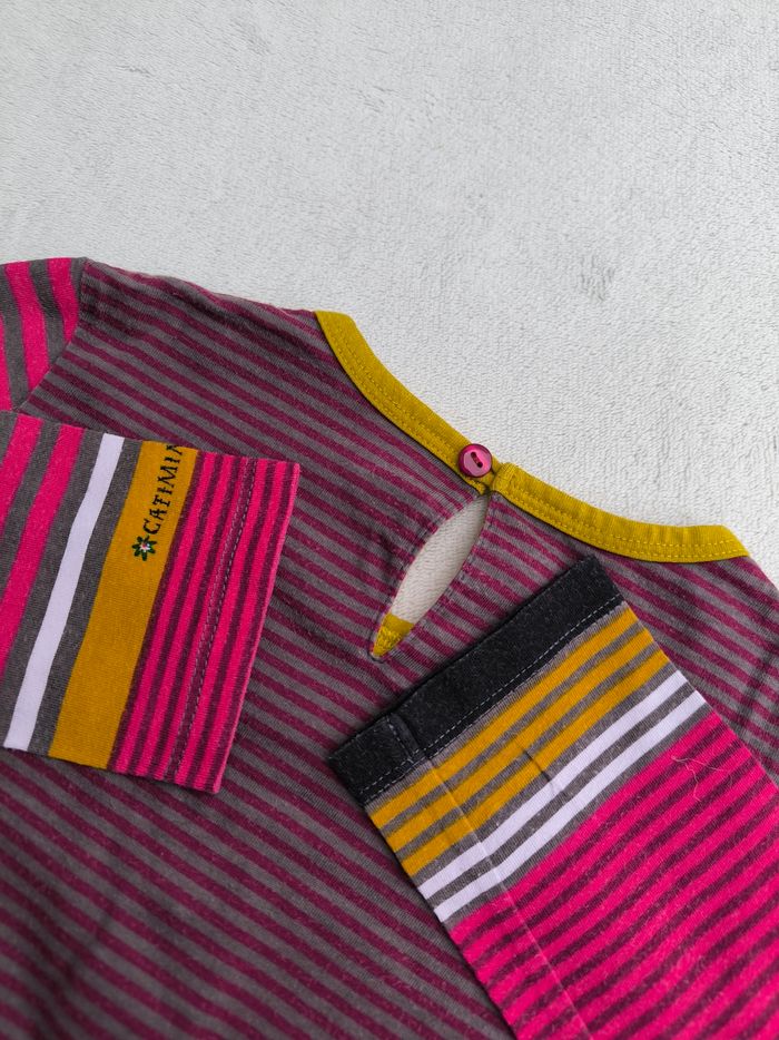 T-shirt à manches longues Marque Catimini Taille 8 ans, 128 cm • Coloris rose, violet, orange, vert, blanc, gris • Imprimés rayures, fleurs, personnes • Goutte au dos • Coton fin • Quelques bouloches En très bon état #evelyne_filles_8ans #evelyne_filles