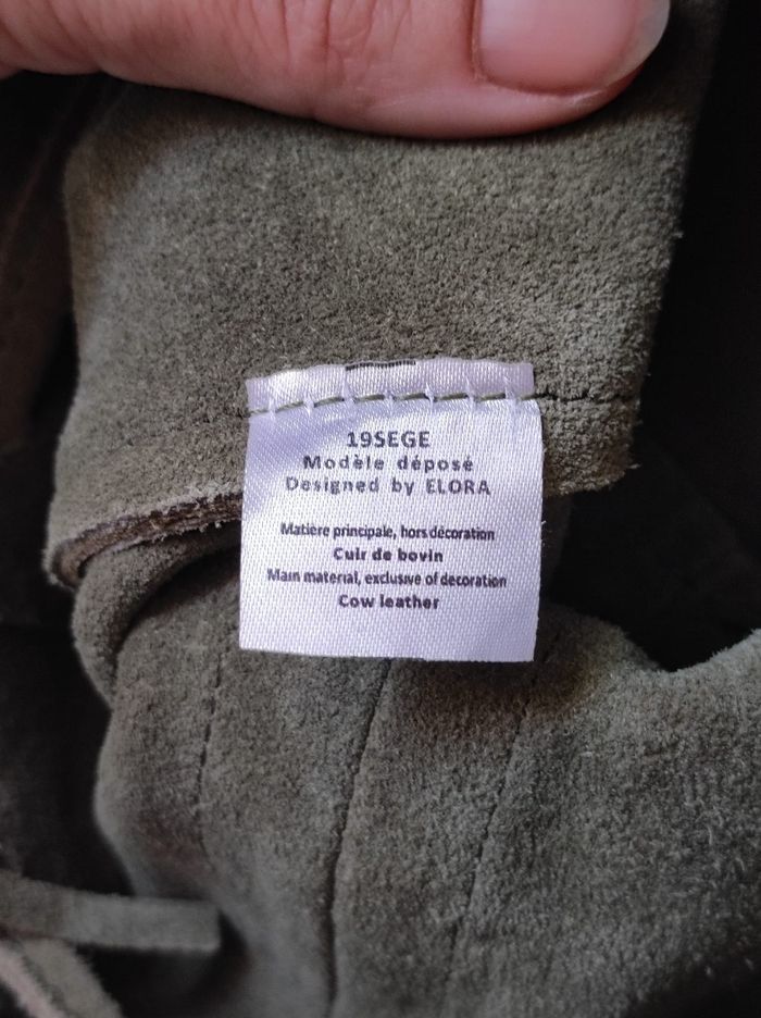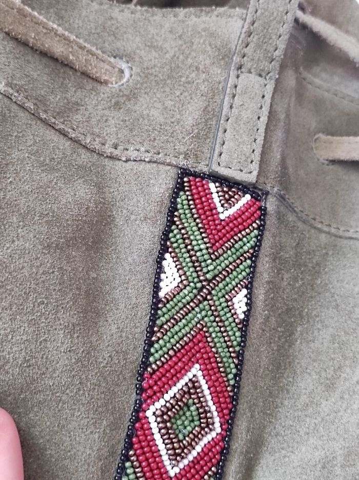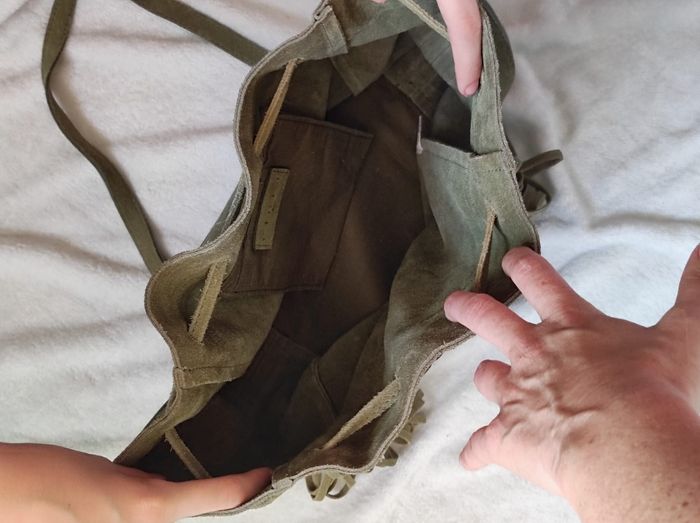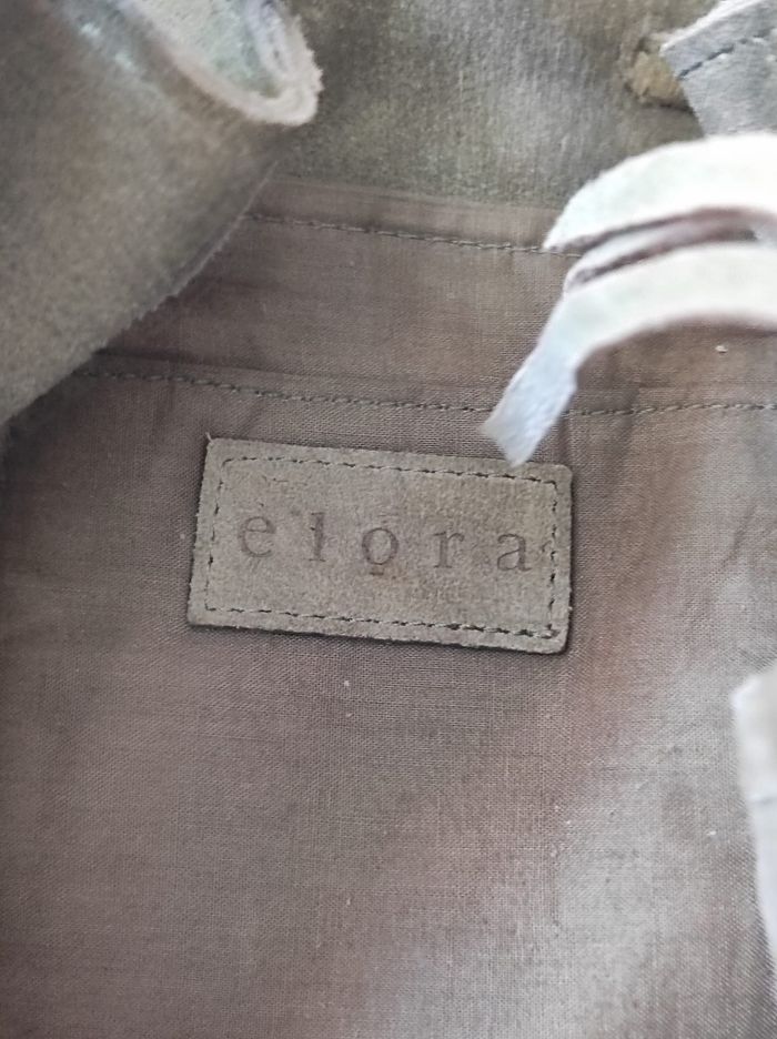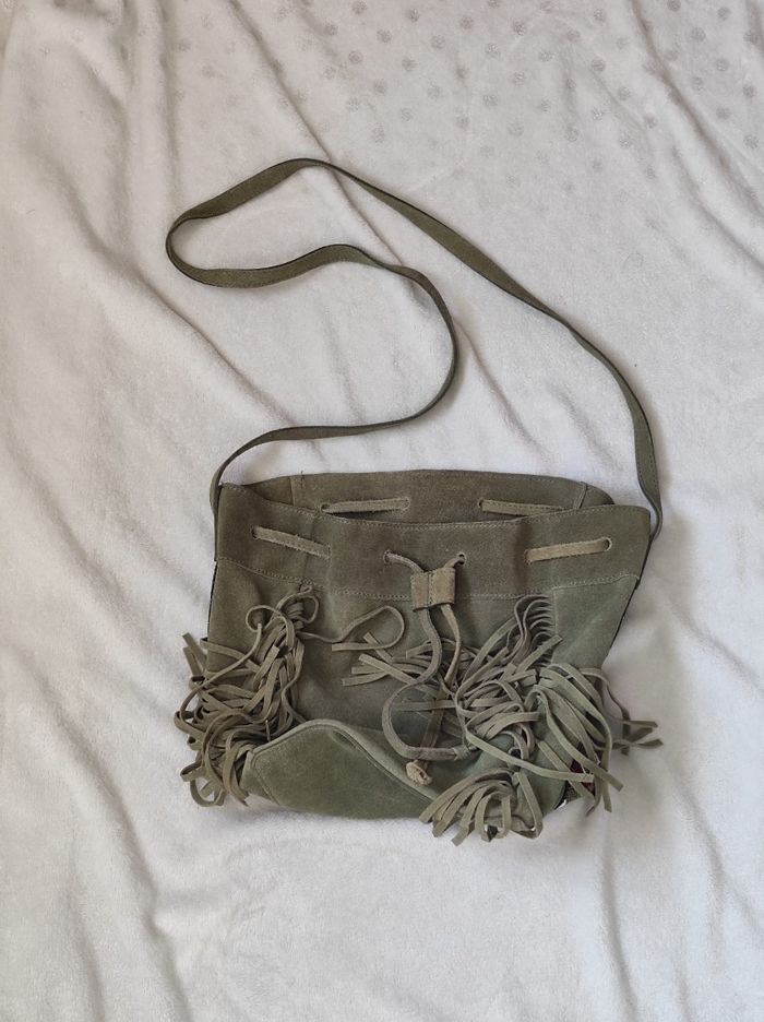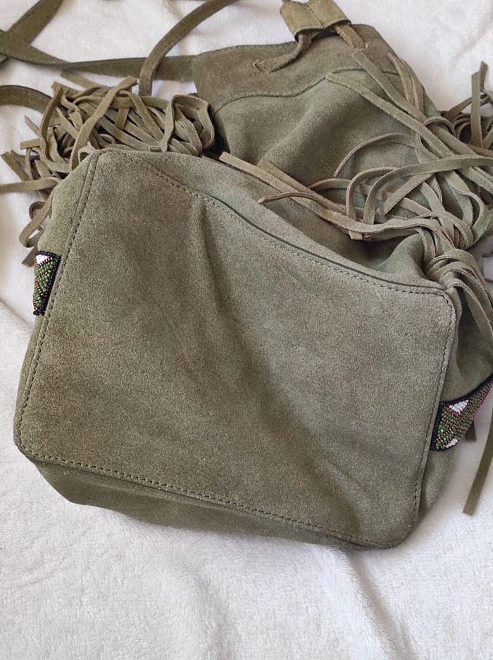 jolie petit sac à main avec bandoulière, sac dite "seau" avec une petite poche intérieure, fermeture système à cordon. Frange et bande à perles sur le côté, pour un look été indien. De couleur vert kaki en cuir. Très bon état général. Marque elora Dimensions H 26,5 cm x L 22,5 cm x P 16 cm.