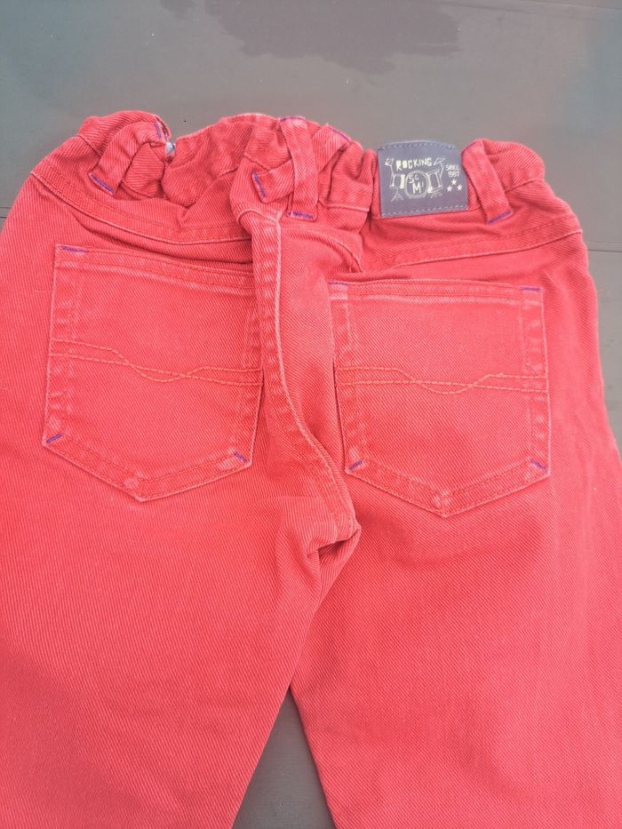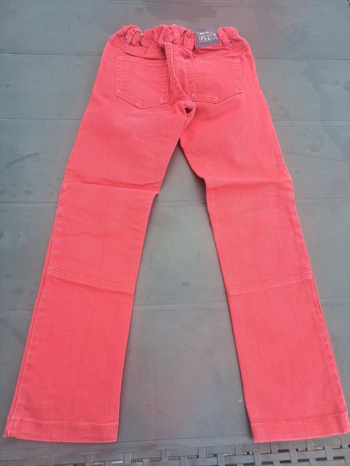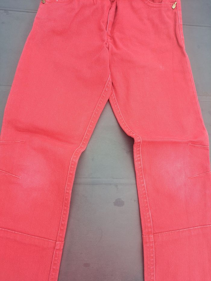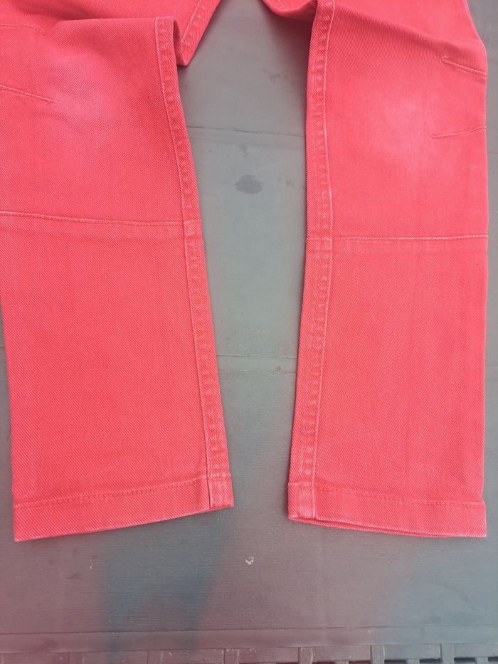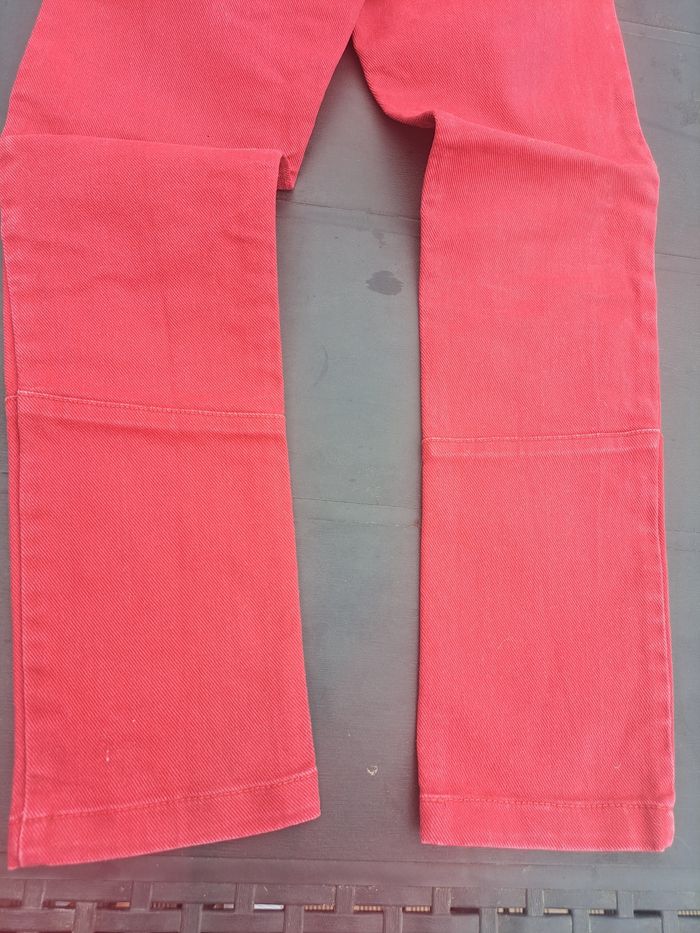Porté. Ferme avec 1 bouton glissière et une fermeture. Réglable à la taille. 3 poches devant et 2 poches plaquées derrière. Stretch. Légèrements décolorés aux genoux. Pas de trou, ni de tâches.