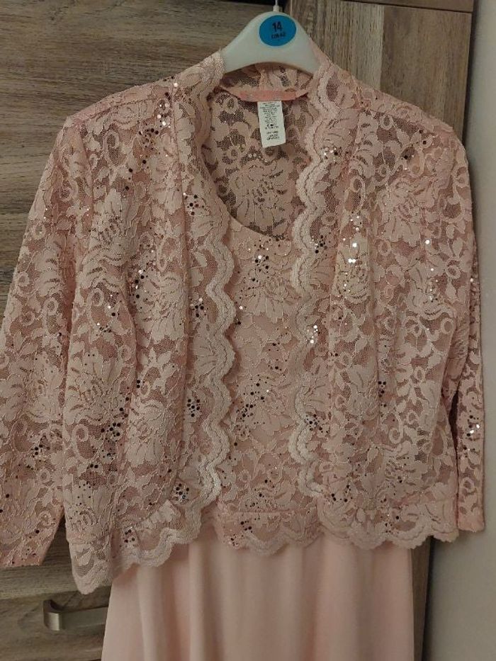 Robe cérémonie avec boléro et serre tête - très bon état - marque NINA LOO -T44 comprenant : Elégant robe mousseline doublée couleur rose saumon sans manches -dimensions aisselle à aisselle 47 cm longueur 105cm -100 % polyester Veste boléro même ton couleur manches 3/4 avec son serre tête fleur