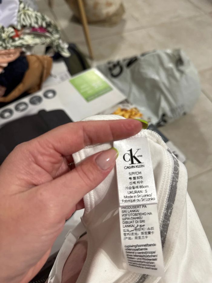 brassière Calvin Klein, en taille S : Cette brassière Calvin Klein est de couleur blanc pur, offrant un design épuré et minimaliste, très caractéristique de la marque et de sa ligne "CK ONE". Il s'agit d'un modèle de type "bralette" ou brassière sport/confort, sans armatures, conçu pour un confort optimal et une grande liberté de mouvement. La coupe est simple, avec un décolleté droit. Les bretelles sont fines et élastiques, de la même couleur blanche. La bande sous la poitrine est large et élastique, et elle est ornée du logo iconique "CALVIN KLEIN CK ONE" répété en gris ou en ton sur ton clair, ce qui lui confère une touche de reconnaissance immédiate de la marque. Le tissu semble être un mélange doux de coton et d'élasthanne, offrant une sensation agréable sur la peau et une bonne extensibilité pour un ajustement parfait. En taille S, cette brassière est idéale pour les personnes ayant une petite à moyenne poitrine, et elle est parfaite pour la détente, le sport léger ou comme sous-vêtement confortable au quotidien. Elle incarne le style moderne, confortable et intemporel pour lequel Calvin Klein est réputé.