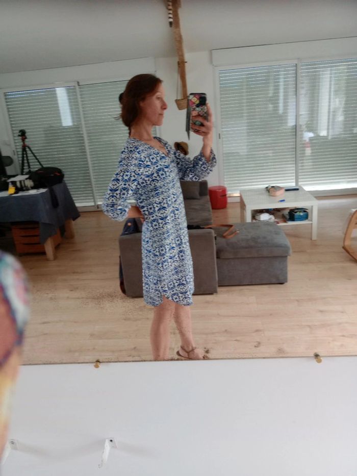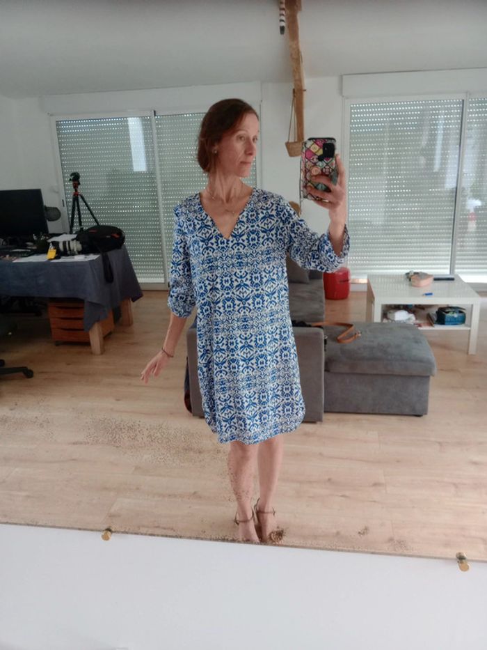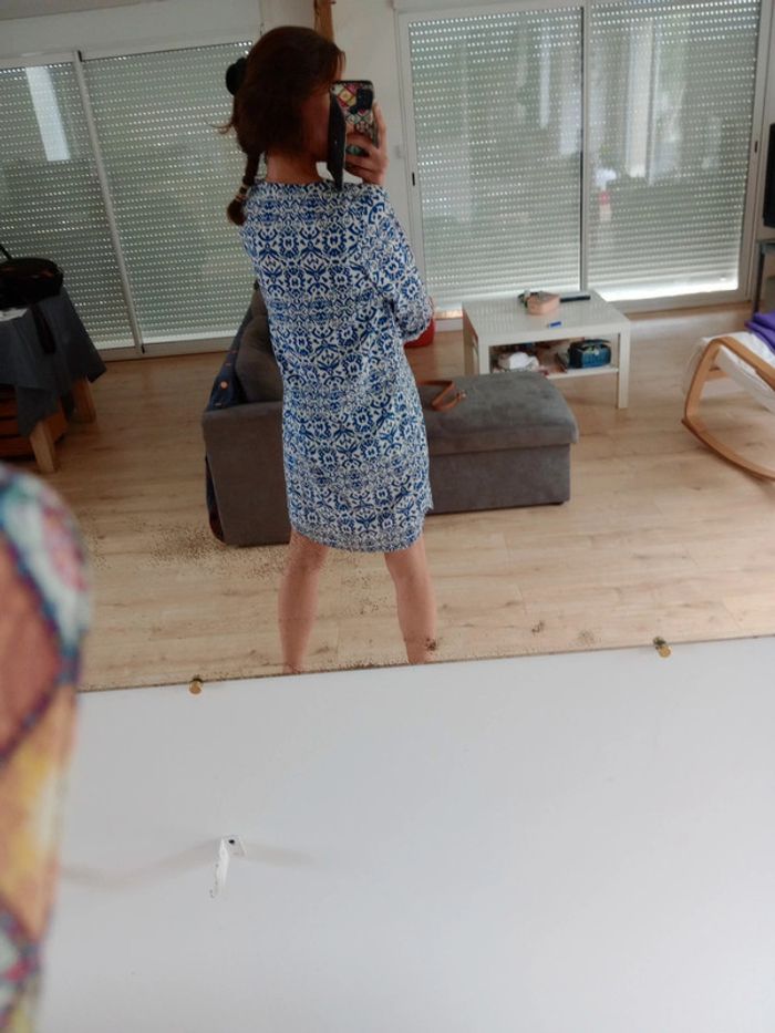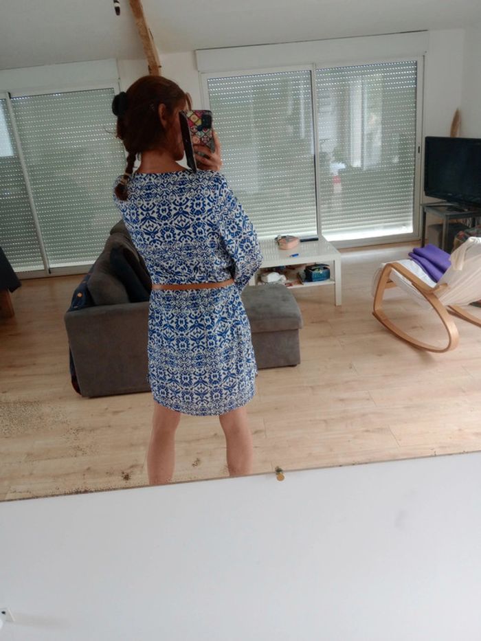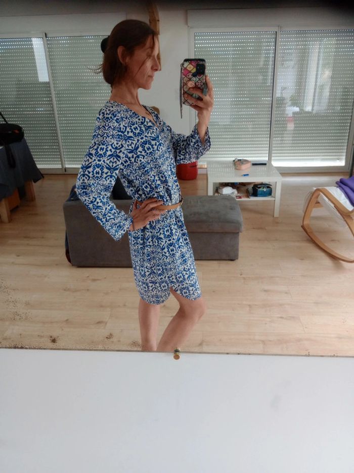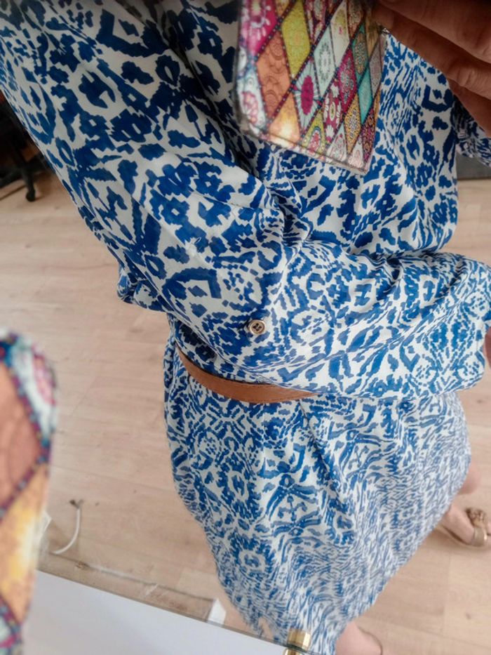 Magnifique robe 🥰 au motifs graphiques Col v...possibilité de mettre un petit lien pour agrémenter ce col 😉 Présence d'un petit bouton et d'un lien au niveau des manches afin de pouvoir les remonter Fendue sur le côté Ceinture offerte ☺️ Épaule 41 cm aisselle 53 cm Longueur 96 cm #carineleray_femme_38