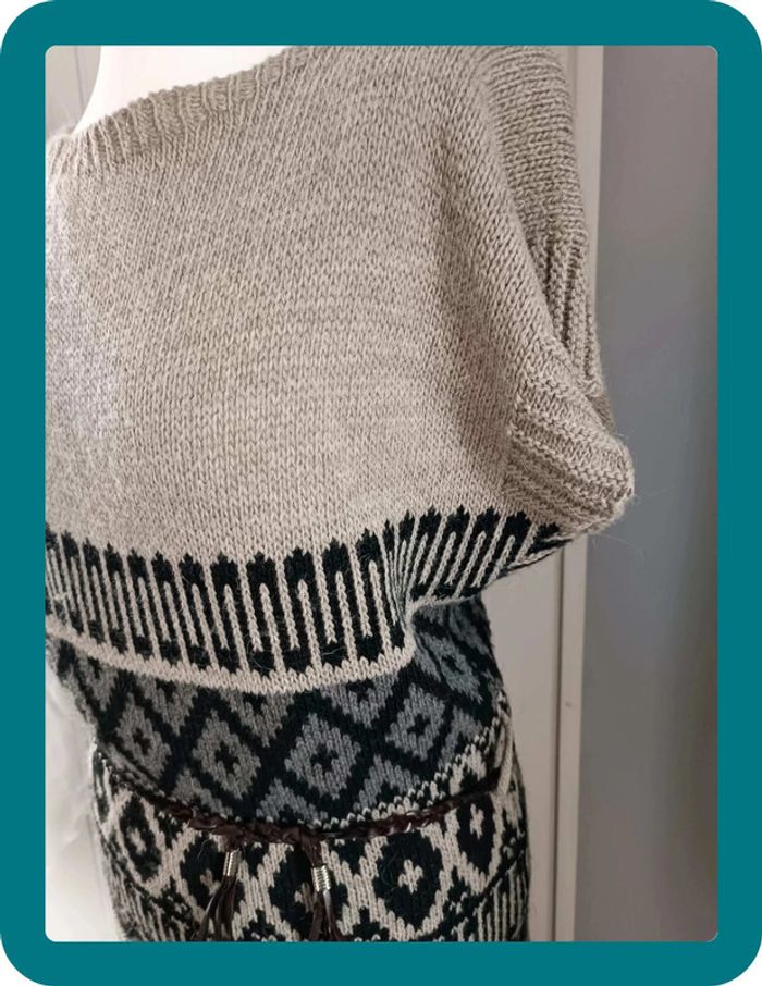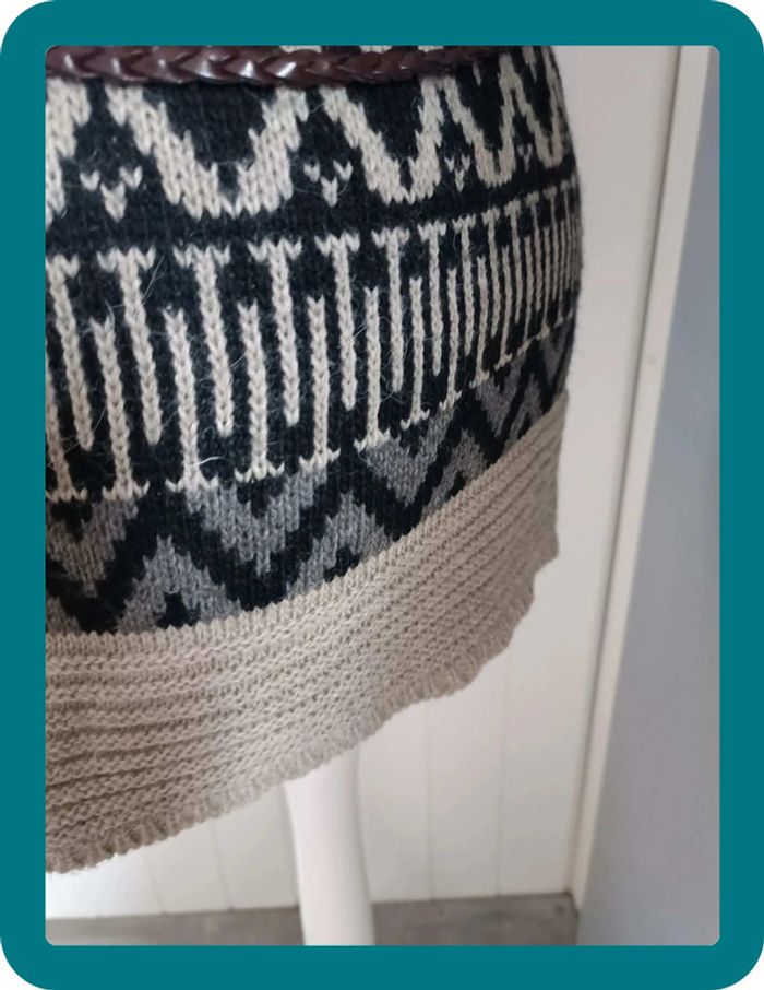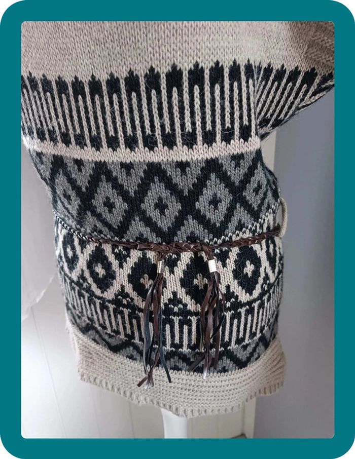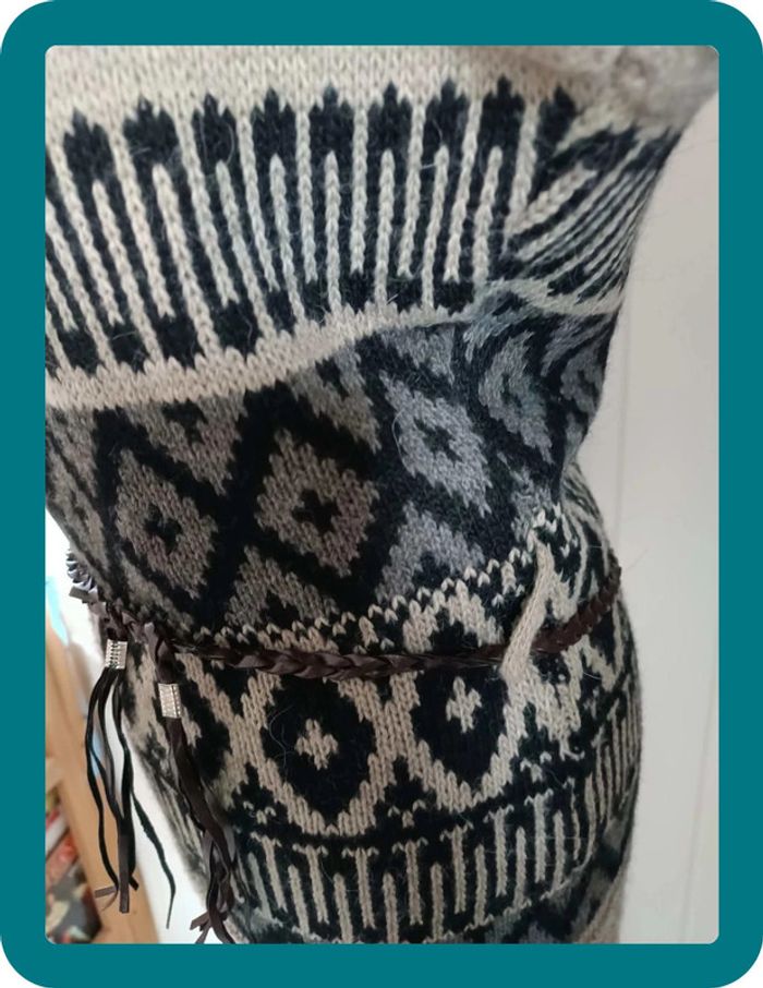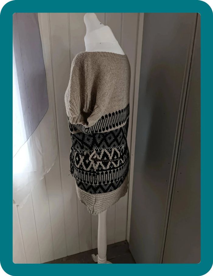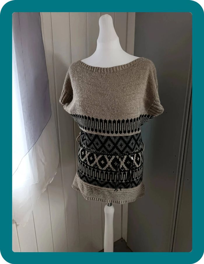 Pull marron avec imprimés noirs pull tunique avec ceinture marron à la taille à porter sur un jean ou un legging long et des bottes col large pouvant dénuder une épaule taille 38 (absence d'etiquetage : mesure épaule à épaule 38 cm) #ka_nine_femme_tailletrentehuit #ka_nine_femme_vetements