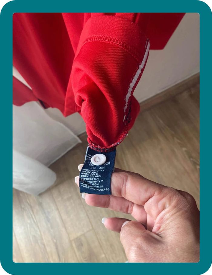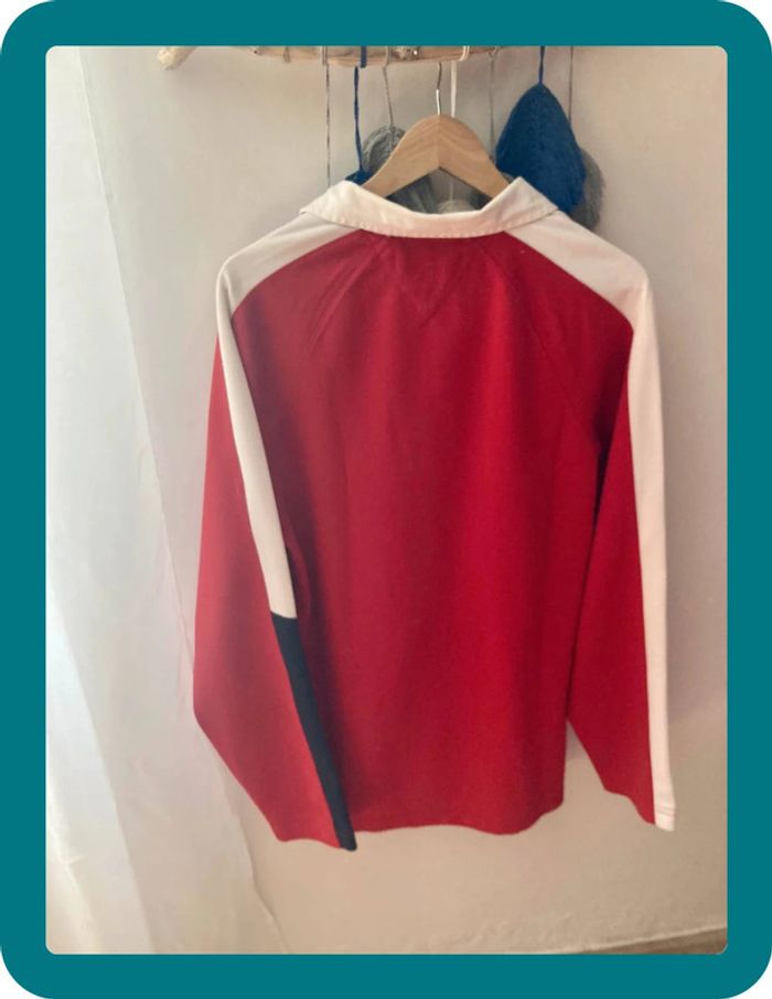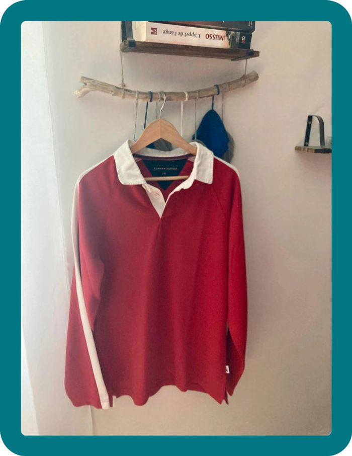 Polo rouge, à manches longues avec bandes blanches et col blanc