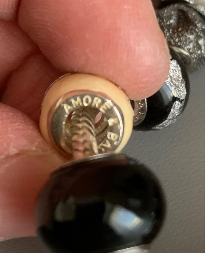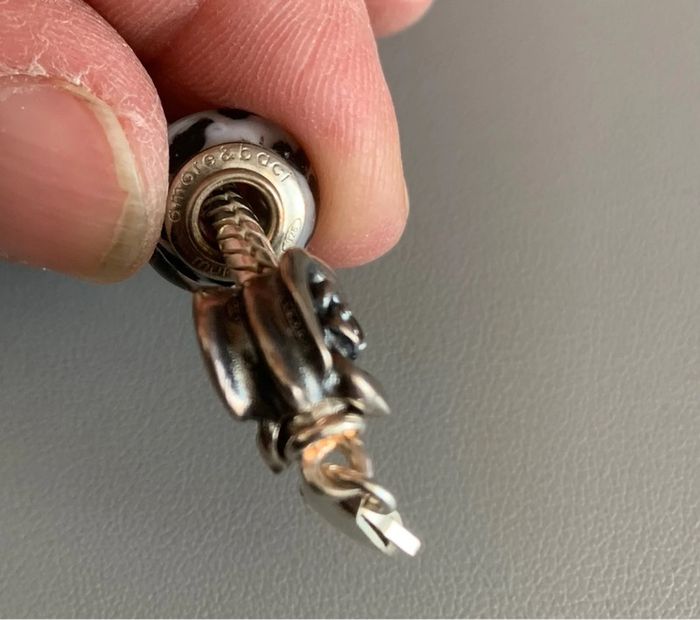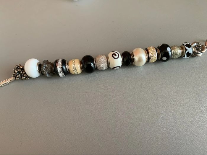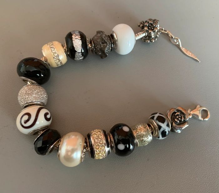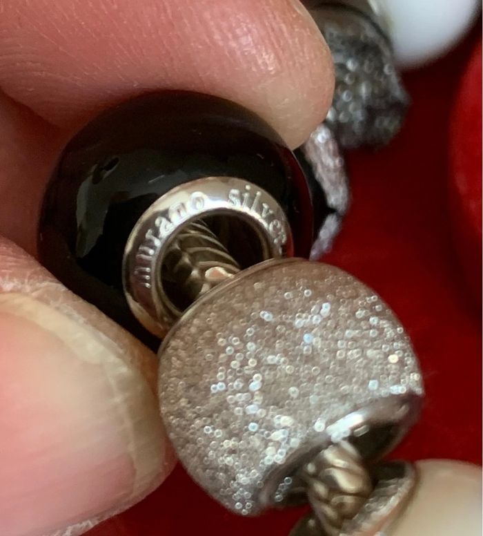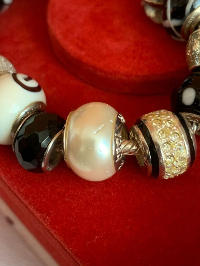 Tous les charms sont signés et poinçonnés 925 : véritables perles de verre Murano, émail, strass et perle nacrée synthétique (léger choc sur celle-ci voir photo).