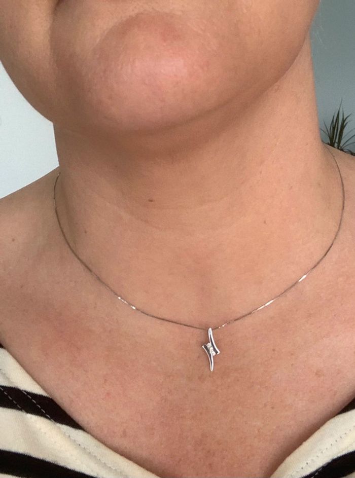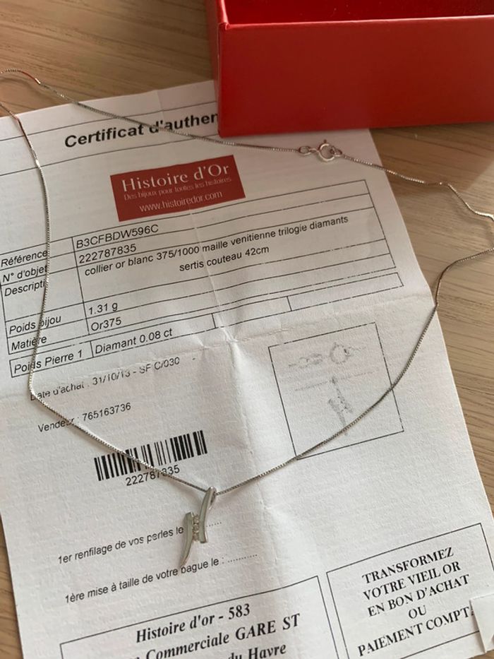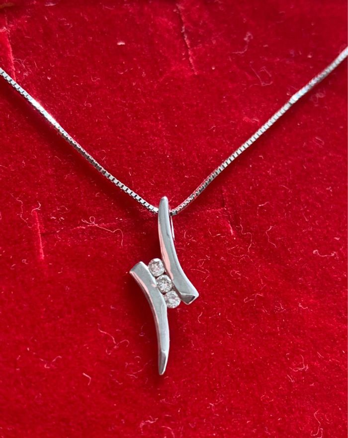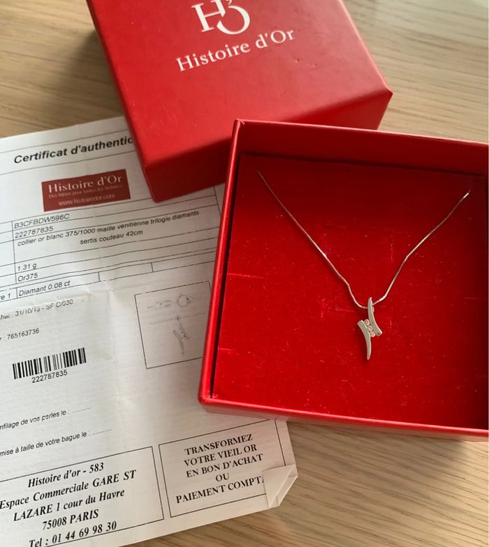 Collier délicat en or blanc 375/1000 (9k) et trilogie diamants de chez Histoire D’Or.