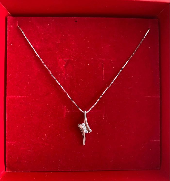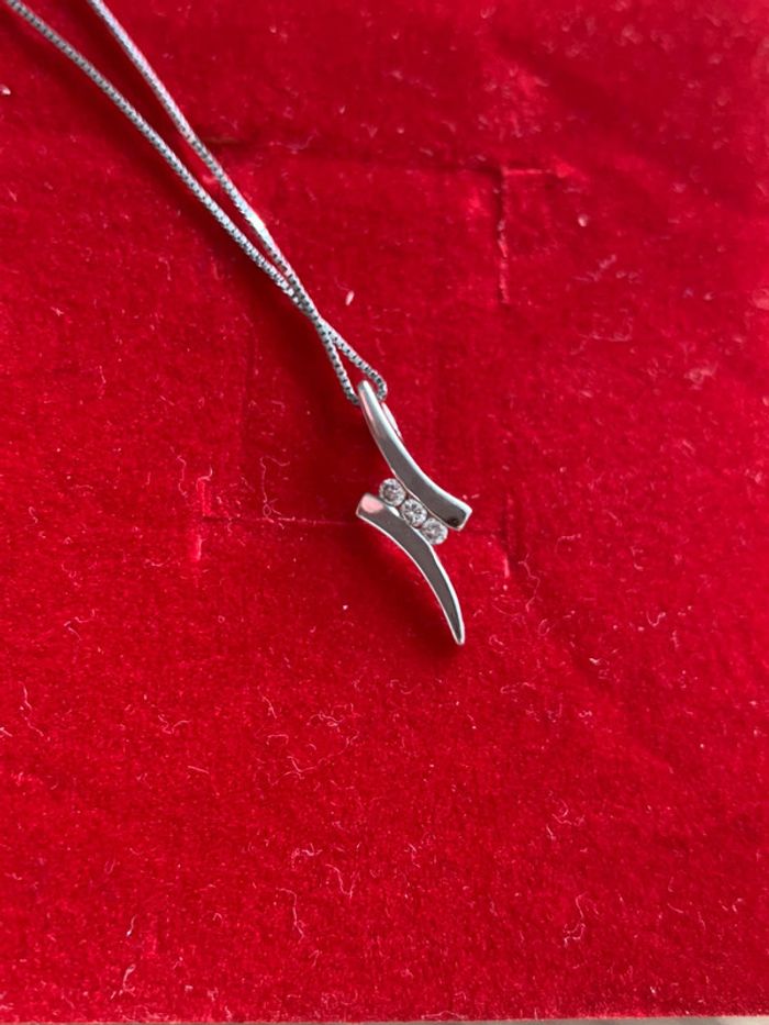 Chaine fine maille vénitienne 42 cm. Pendentif 3 diamants pour 0,08 ct (H : 1,8 cm).