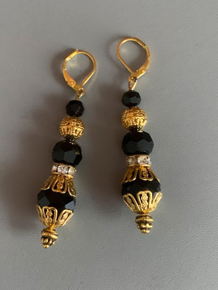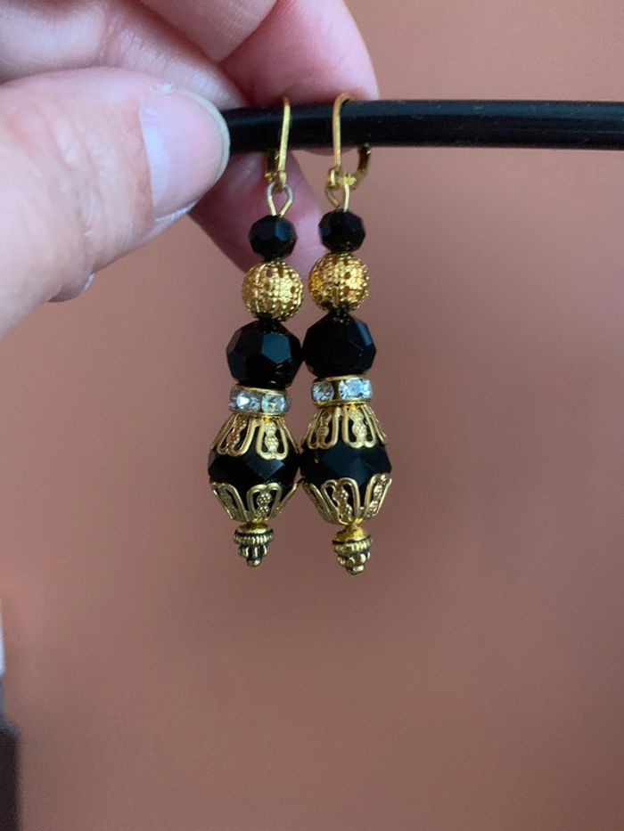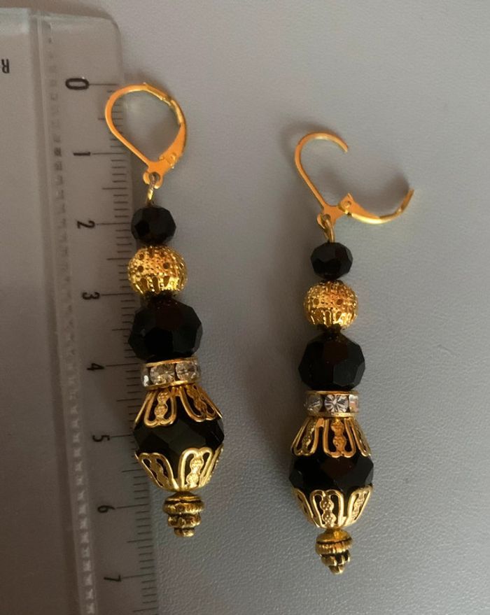 Pendants d’oreilles style victorien en métal doré et perles de verre noires. Mises une fois, excellent état. Pas de photos porté. #cristoliebijoux