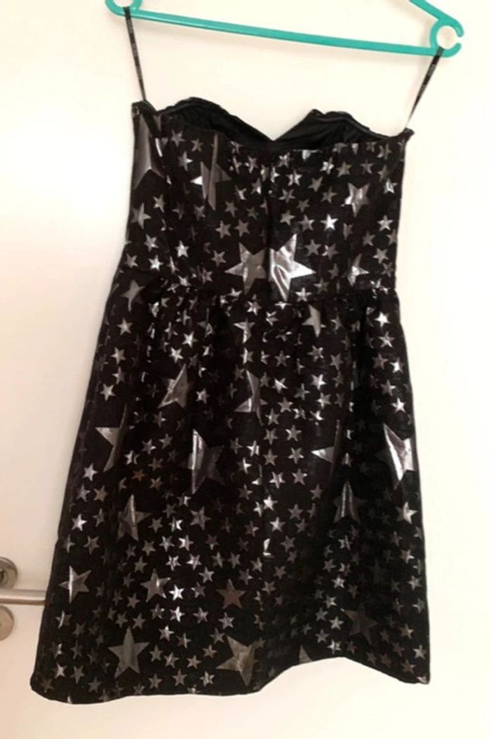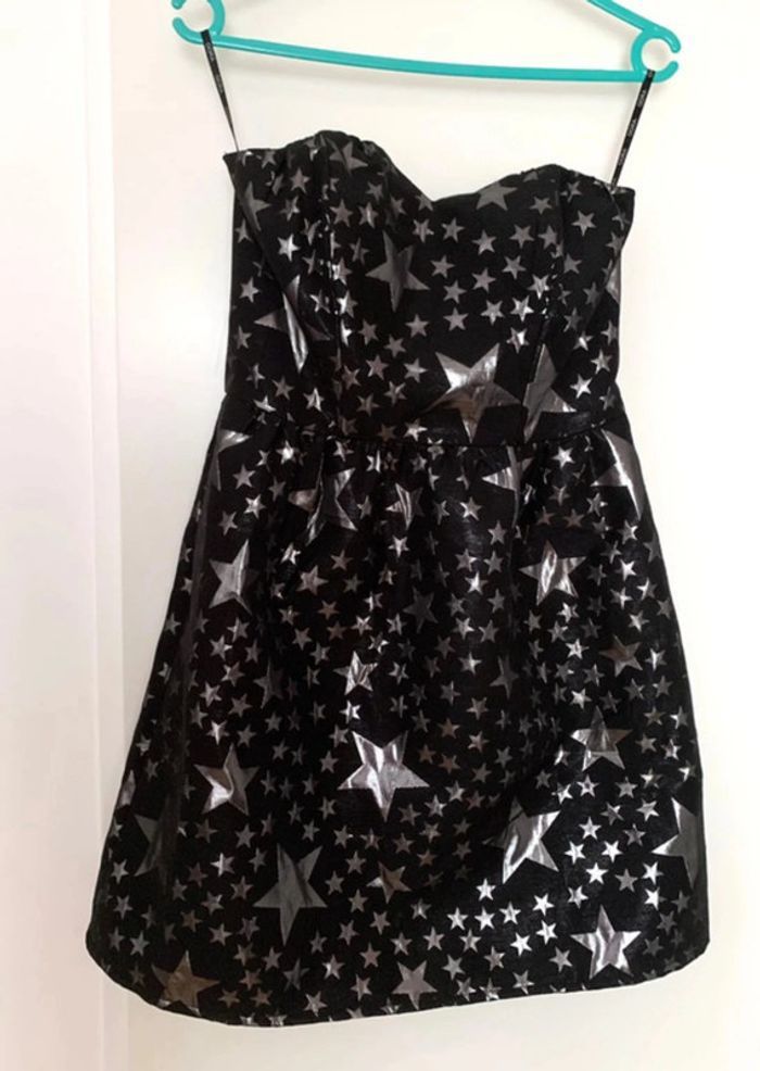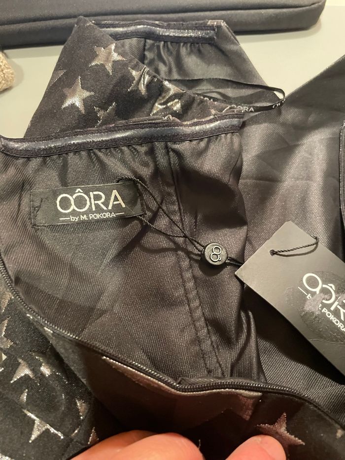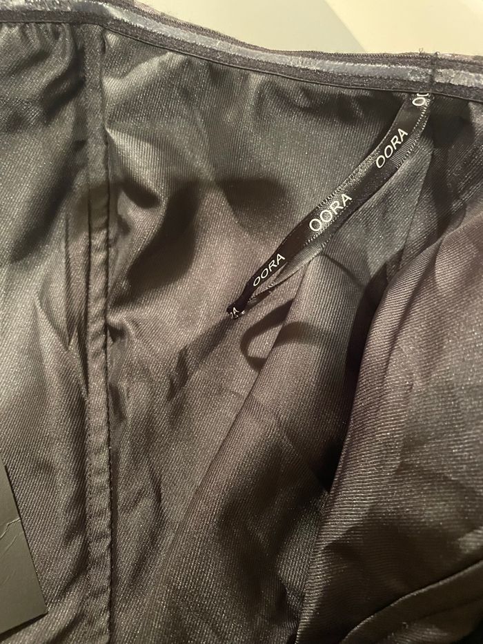Robe du soir Oôra by M. Pokora : bustier maintenu par baleines, bande antiglisse et élastique en bordure, zip au dos. Doublée. Forme évasée en bas, longueur au dessus du genou environ (voir mesures).