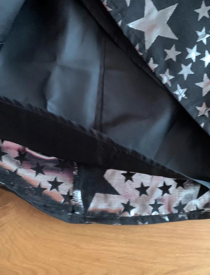 Très beau tissu jacquard avec étoiles argentées sur fond noir.