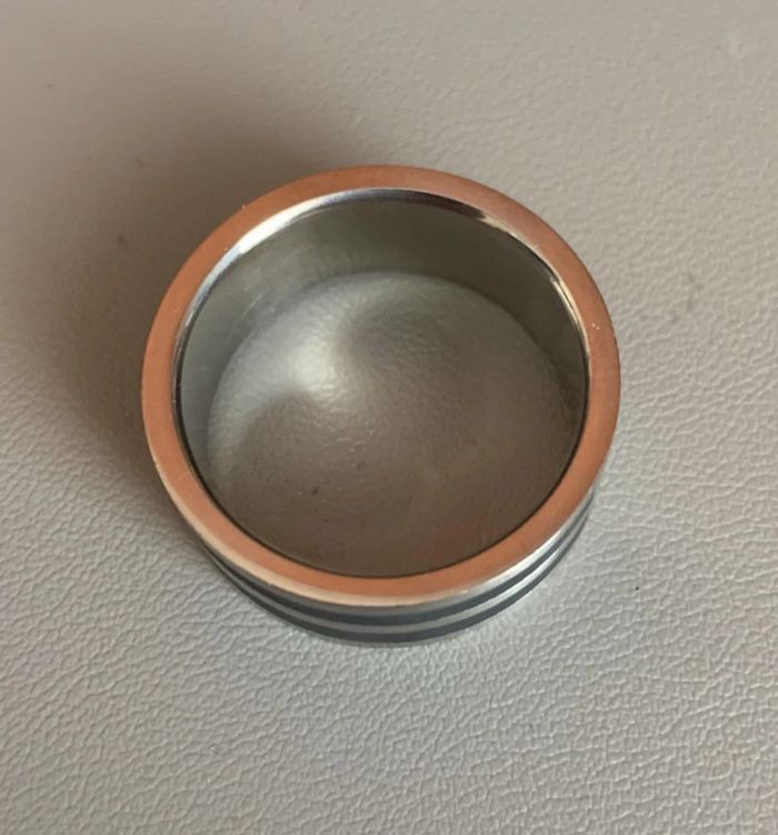 Anneau en acier, motif feuille de chanvre ou cannabis et double bandes noires. Modèle homme ou mixte. Peut servir d’anneau de foulard. Largeur : 1 cm. Taille 66. Neuve. #cristoliebijoux #cristoliehomme #cristolieaccessoires
