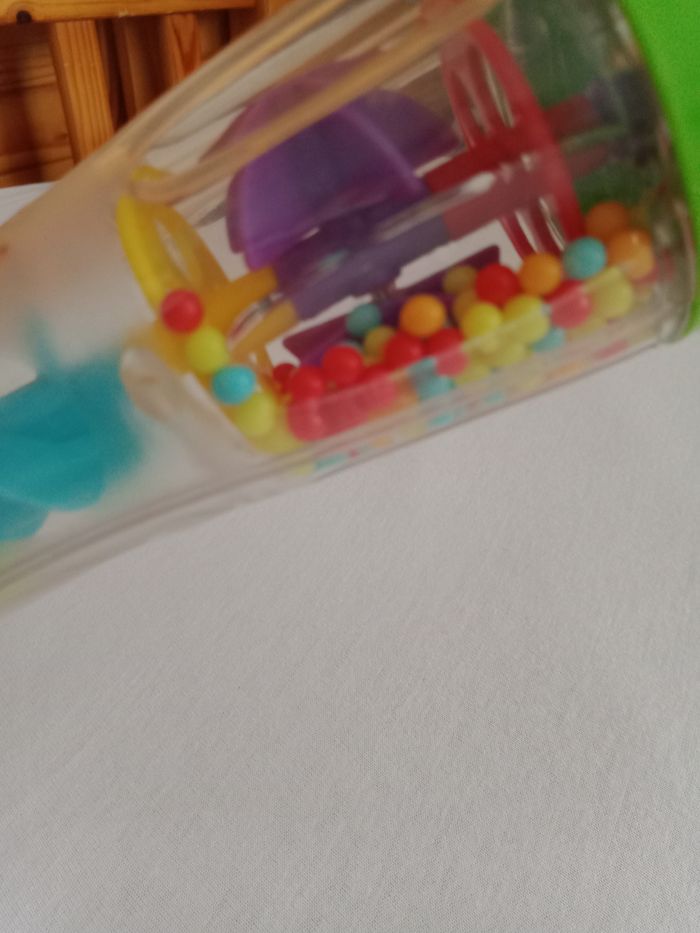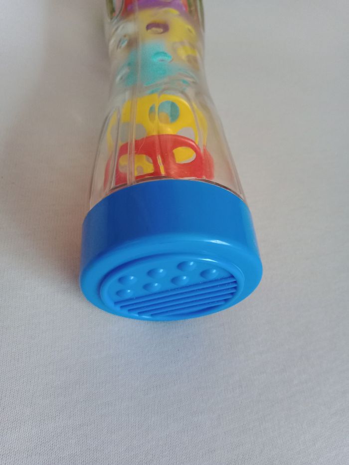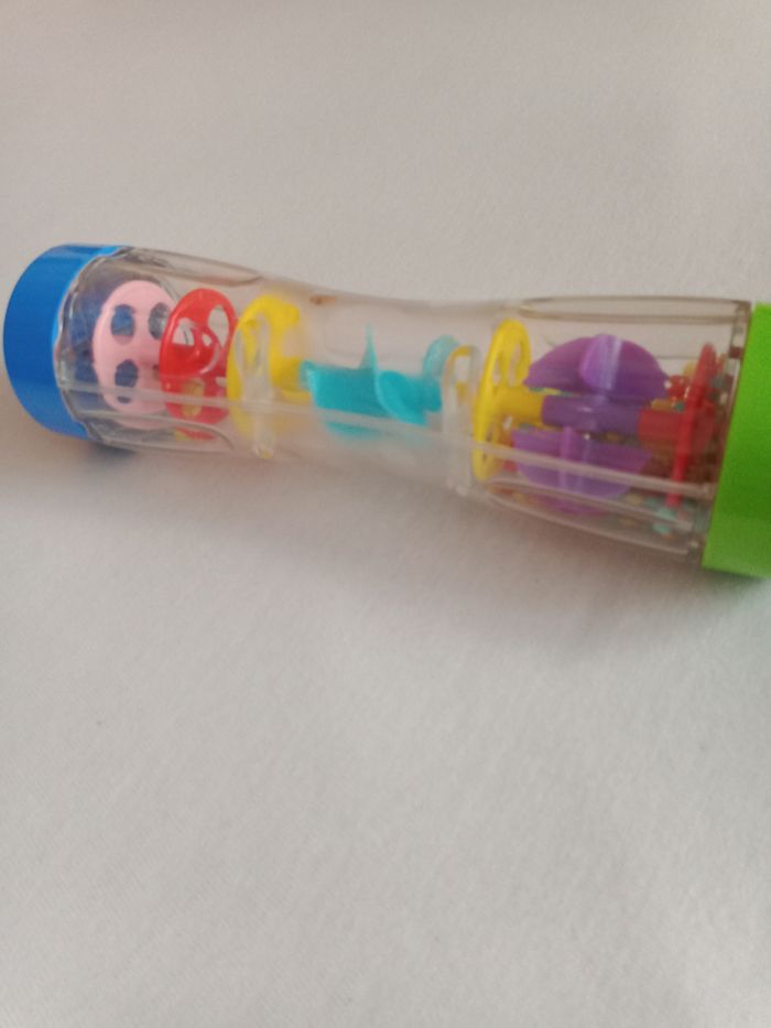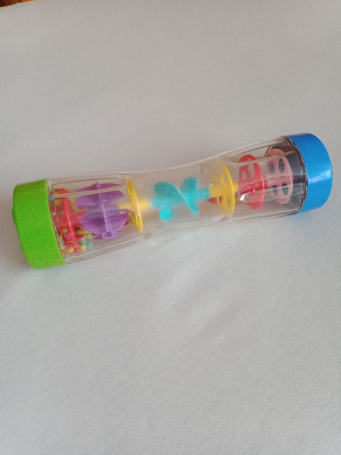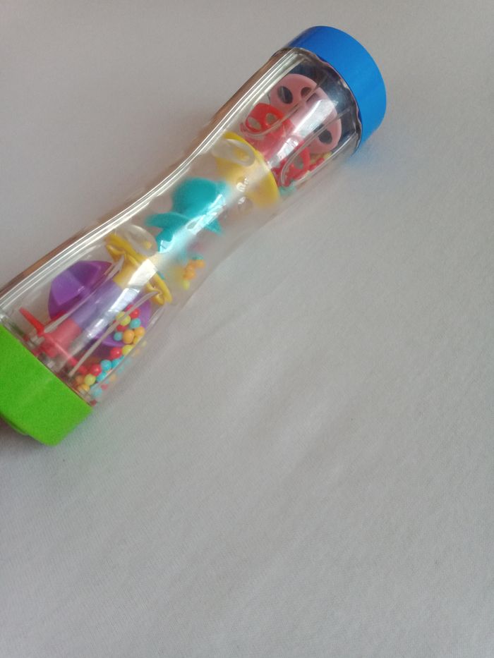 Bâton de pluie avec 1 bout qui fait miroir Retourne ce bâton de pluie et observe les billes de couleur. En perlant comme des gouttes, celles-ci reproduisent le son apaisant de la pluie qui tombe. Grâce à ses courbes idéales tu peux le prendre en mains facilement et le déposer où bon te semble. Grâce à sa prise en main facile, ce jouet peut facilement être utilisé comme un hochet. Parfait pour le développement sensoriel.