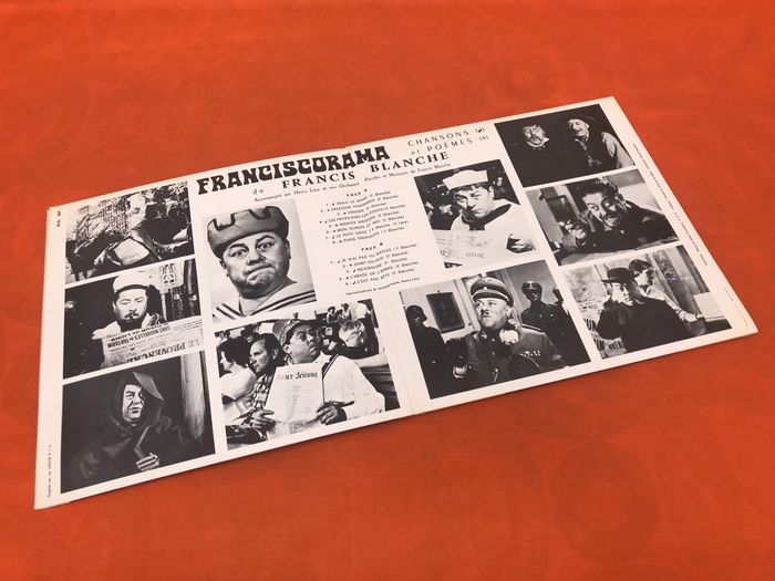 Vinyle 33 tours Franciscorama de Francis Blanche Chansons et Poèmes (1971) Disques Vogues SLD 807 A1 Voilà Le Singe A2 Arlequin Poignardé A3 Virginie A4 Les Frites Avec Les Doigts A5 Mortes Saisons A6 Mon Oursin Et Moi A7 Le Petit Gros A8 Paris Tropiques B1 Je N'ai Pas Vu Naples B2 Saint Sulpice B3 Nevermore B4 L'image De L'arbre B5 C'est Pas Bête