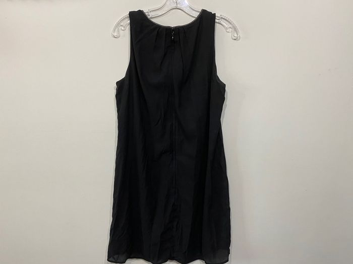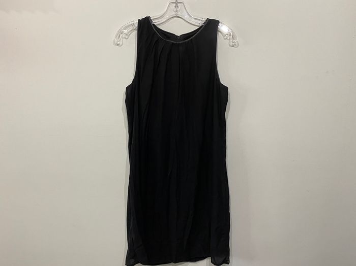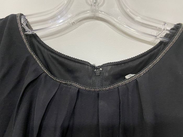 Robe avec petit liseré sur le col. Doublure à l’intérieur. Zip invisible sur le trois quarts de la robe dans le dos. Croché en haut du zip