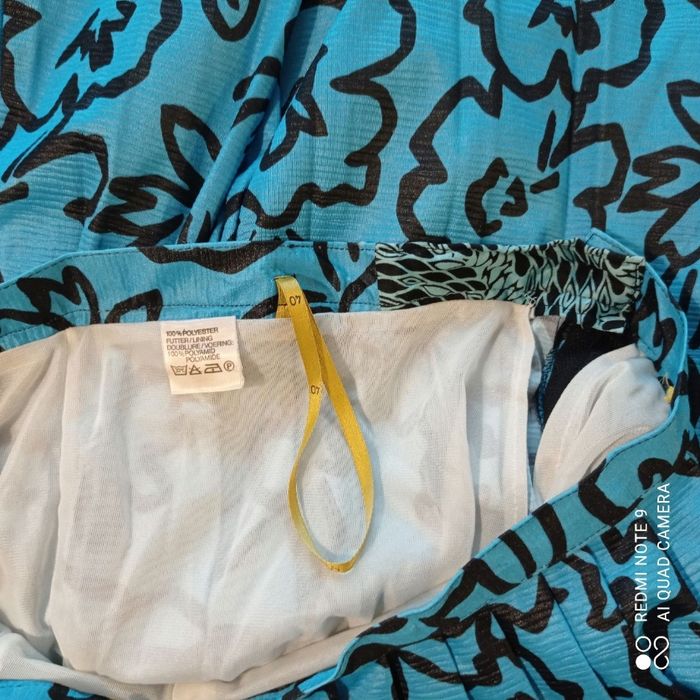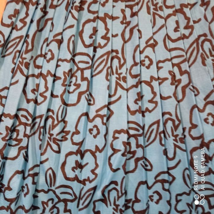 Polyester. Fluide. Plissée. Taille estimée. Mesures prises à plat : largeur à la taille : 41cm, longueur : 73cm. C6