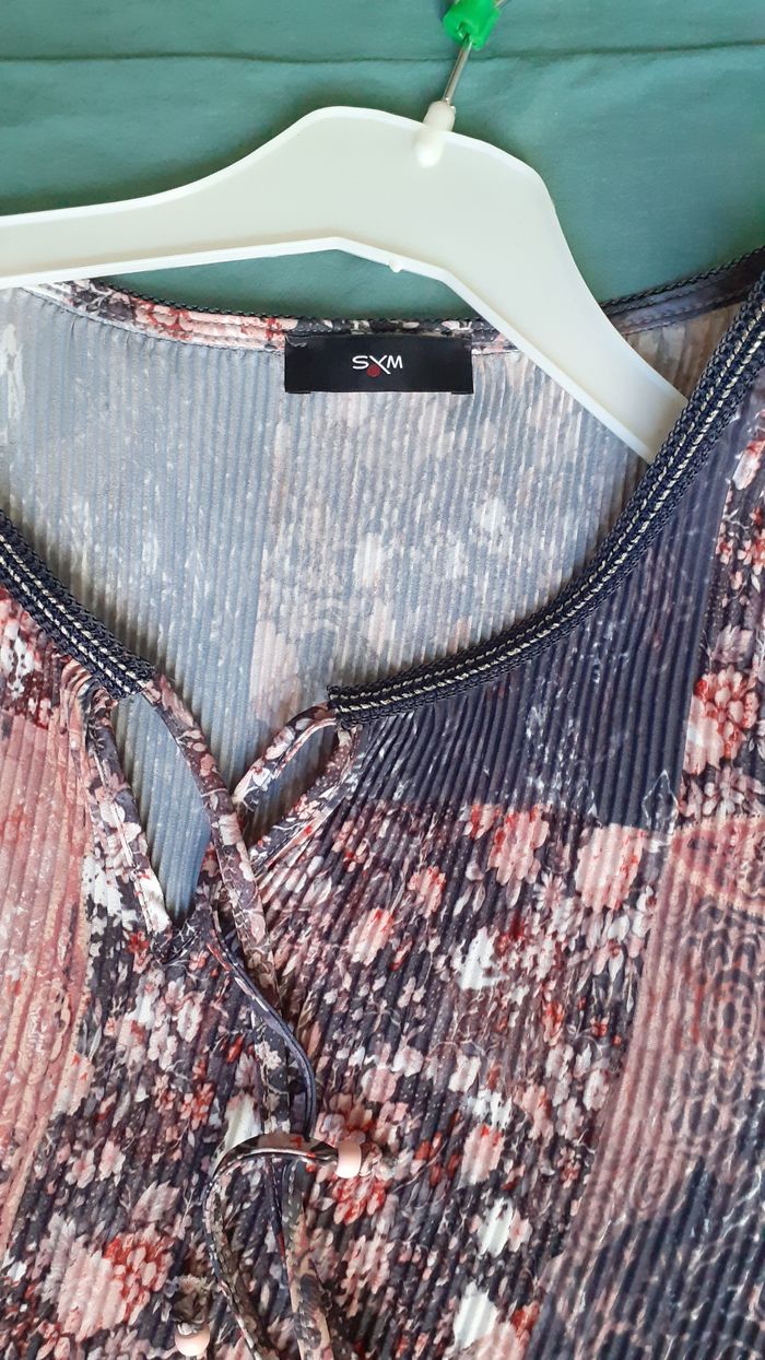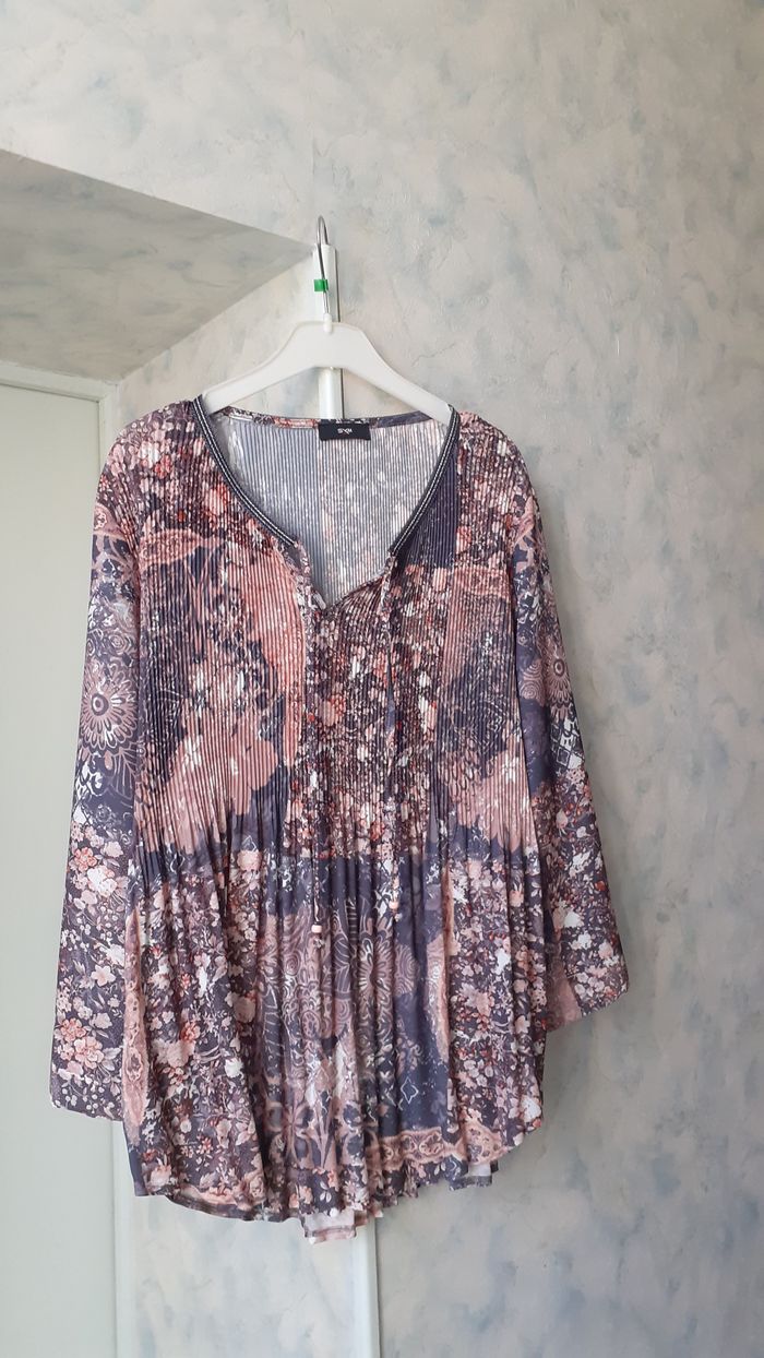 Vends un top manches longues tout plissé, en polyester, col en V avec liens, base arrondie, couleur gris et rose, marque Sym, taille 46-48. Longueur de l'épaule à la base : 70 cm Largeur aisselle à aisselle : 52 cm.