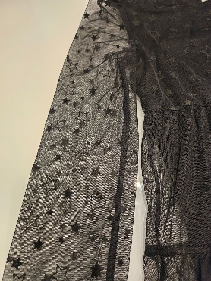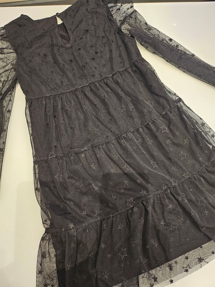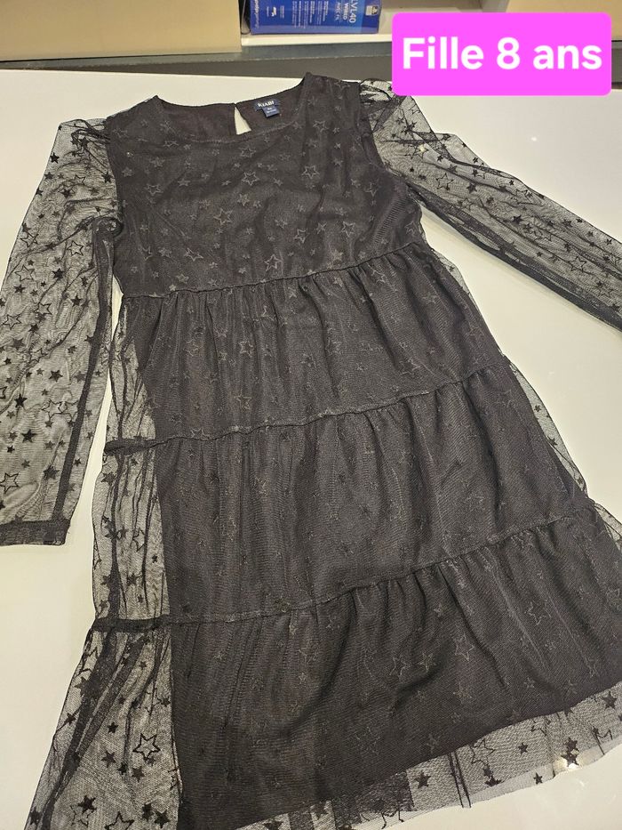 Robe noire dentelle avec étoiles. Doublure. Petit bouton dans le dos. Marque : Kiabi Taille : 8 ans