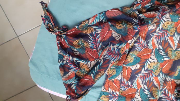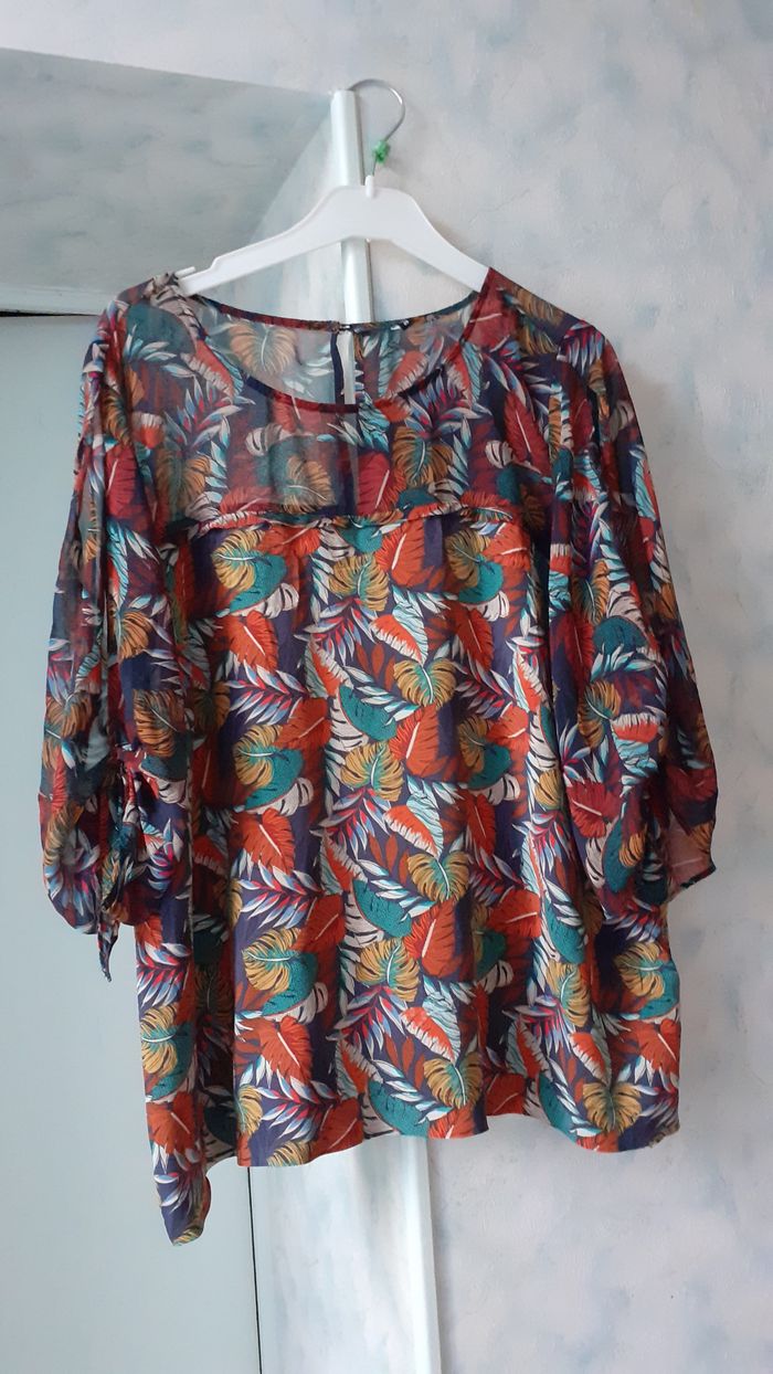 Vends une blouse manches 3/4 fendues sur le dessus et terminées par un noeud 100 % polyester, manches et haut du buste en voile et le reste opaque, coupe ample,couleur orange, camel et vert, taille 48 sur l'étiquette. Longueur de l'épaule à la base : 62 cm Largeur aisselle à aisselle : 58 cm Largeur au niveau des hanches : 62 cm.