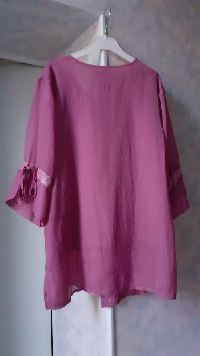 Vends une veste/tunique manches larges 3/4 avec liens, 85 % polyester, 15 % lin, transparente mais doublée sur le haut, gros bouton devant, 1 poche, ne se froisse pas, couleur vieux rose, marque Sabrina, taille XL sur l'étiquette, correspond à un grand 46 ou 48 d'après les mesures. Longueur de l'épaule à la base : 72 cm Largeur aisselle à aisselle : 56 cm Largeur au niveau des hanches : 60 cm.