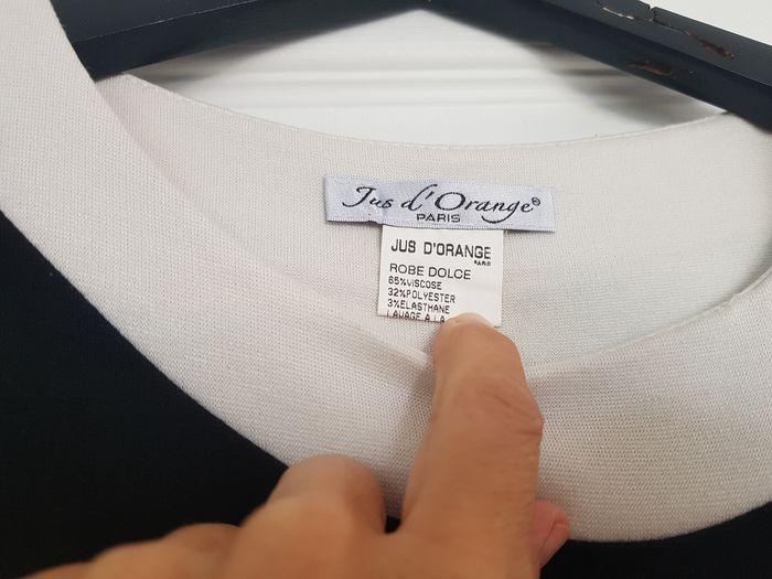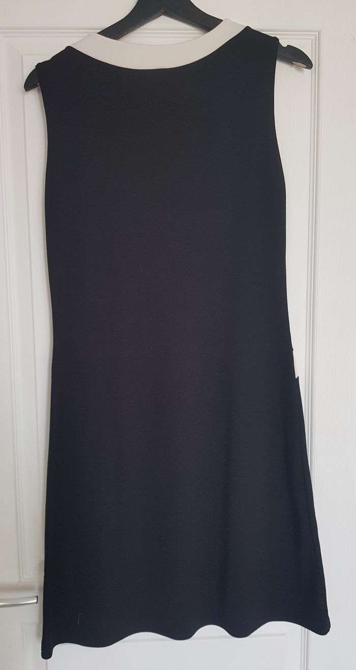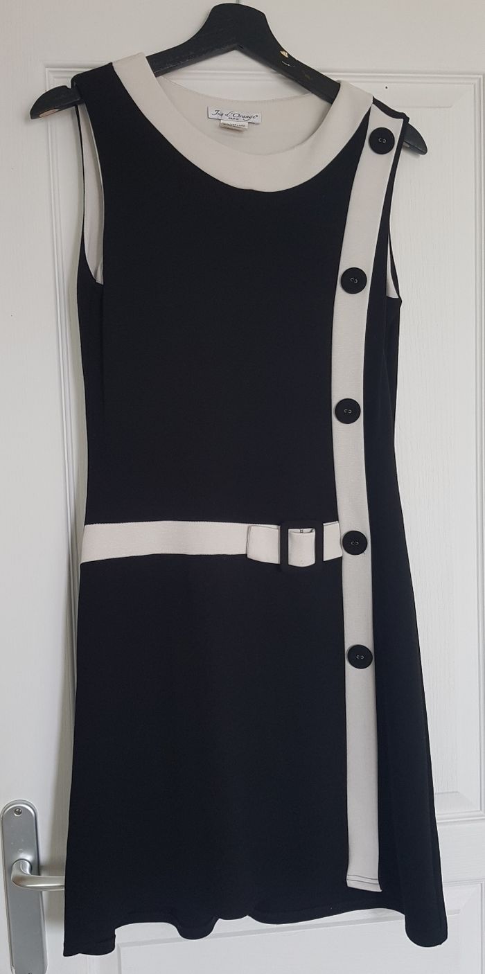 Elégante robe noire et blanche sans manches. Détails boutons et fausse ceinture pour le côté habillé. Marque Jus d'orange. Étiquette de taille coupée mais taille 42. En excellent état. Taille 42