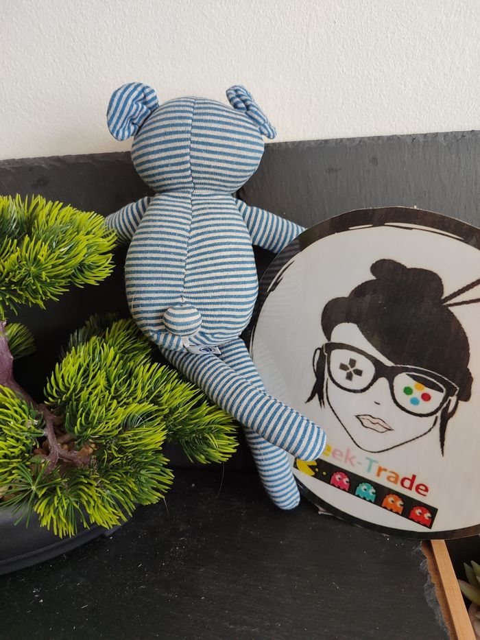 Doudou ours rayé gris bleu foncé petit bateau peluche pantin rayure Marine 3131