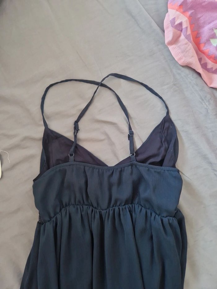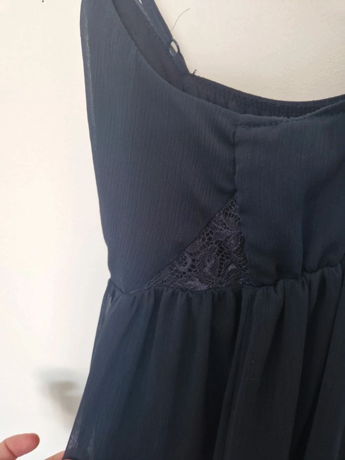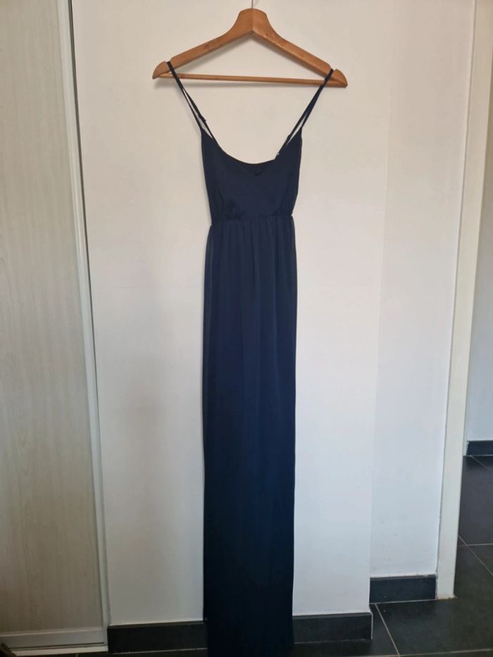 Robe longue portée pour un mariage Bleu marine Très belle avec détail dentelle sur le côté Fine bretelle, dos en croisé Jupon en dessous Robe très légère Avec une veste en jean pour compléter un jolie look