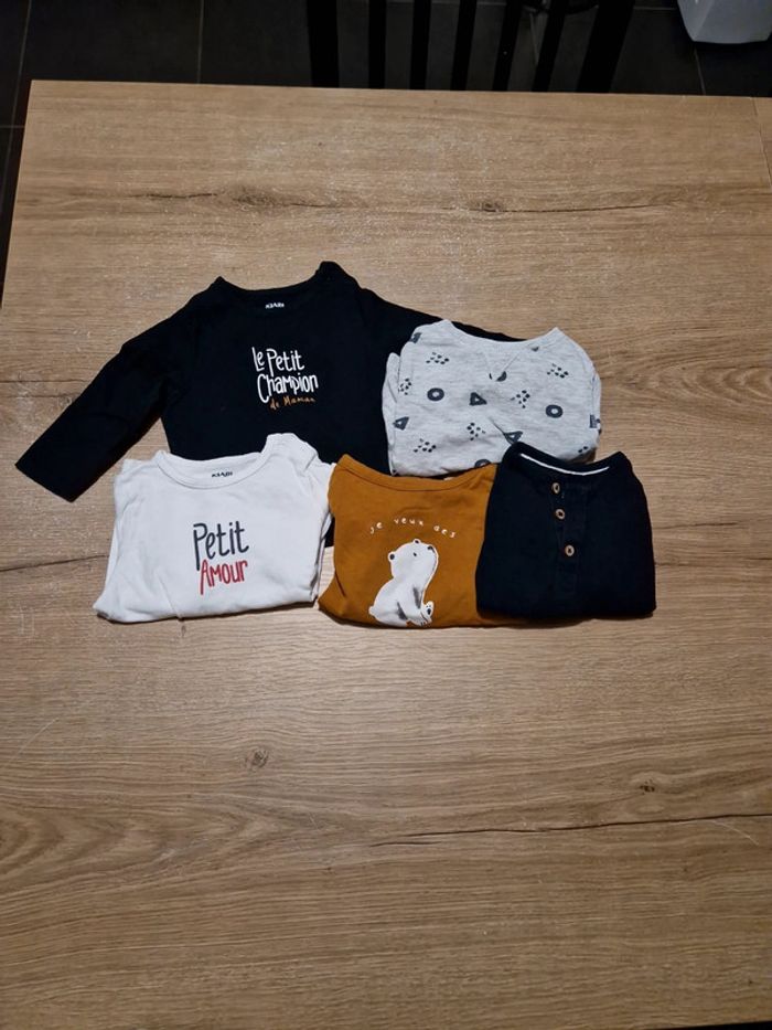 Lot de 5 tee shirt manche longue Taille 6 mois En très bon état Kiabi sauf le jaune qui est tape à l oeil