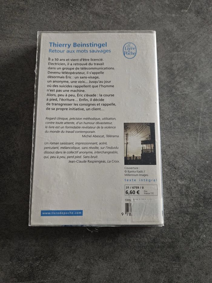 Livre roman Fiction littéraire Roman de société "Retour aux mots sauvages" De Thierry Beinstingel Format poche Révélateur de la violence du monde du travail contemporain Coup de coeur des libraires 240 pages Synopsis : "Il a 50 ans et vient d'être licencié. Electricien, il a retrouvé du travail dans un groupe de télécommunications. Devenu téléopérateur, il s'appelle désormais Eric : un sans visage, un anonyme, une voix... Jusqu'au jour où des suicides rappellent que l'Homme n'est pas une machine. Alors, peu à peu, Eric s'évade : la course à pied, l'écriture... Enfin, il décide de transgresser les consignes et rappelle, de sa propre initiative, un client..." Editeur : Le livre de poche ISBN : 9782213654751 Etat : Très bon état Envoi ou remise en main propre Pour voir des annonces similaires : #robotick_livres #romandesociété #retourauxmotssauvages #thierrybeinstingel #mondedutravail #dystopie