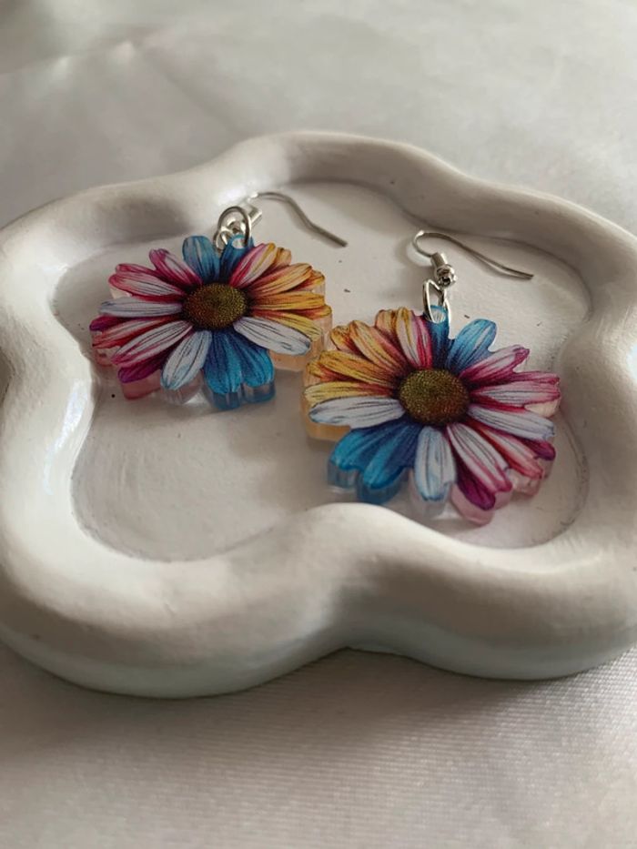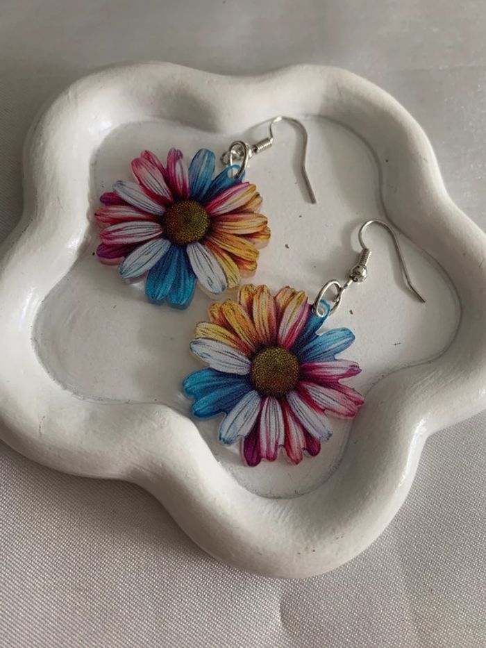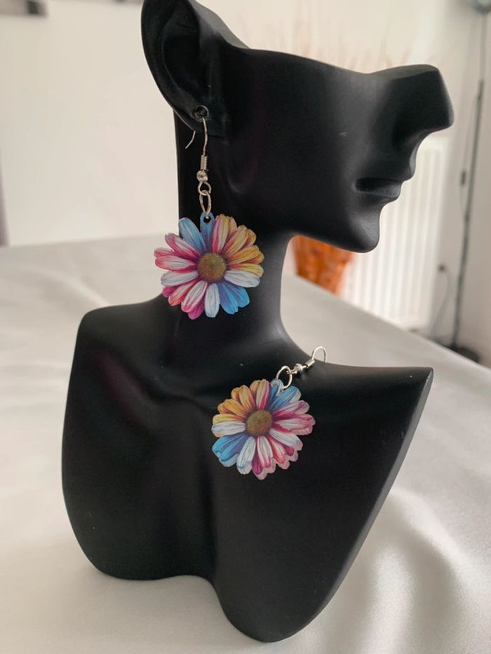 Boucles d’oreilles pendantes fleur marguerite multicolore - photo numéro 5