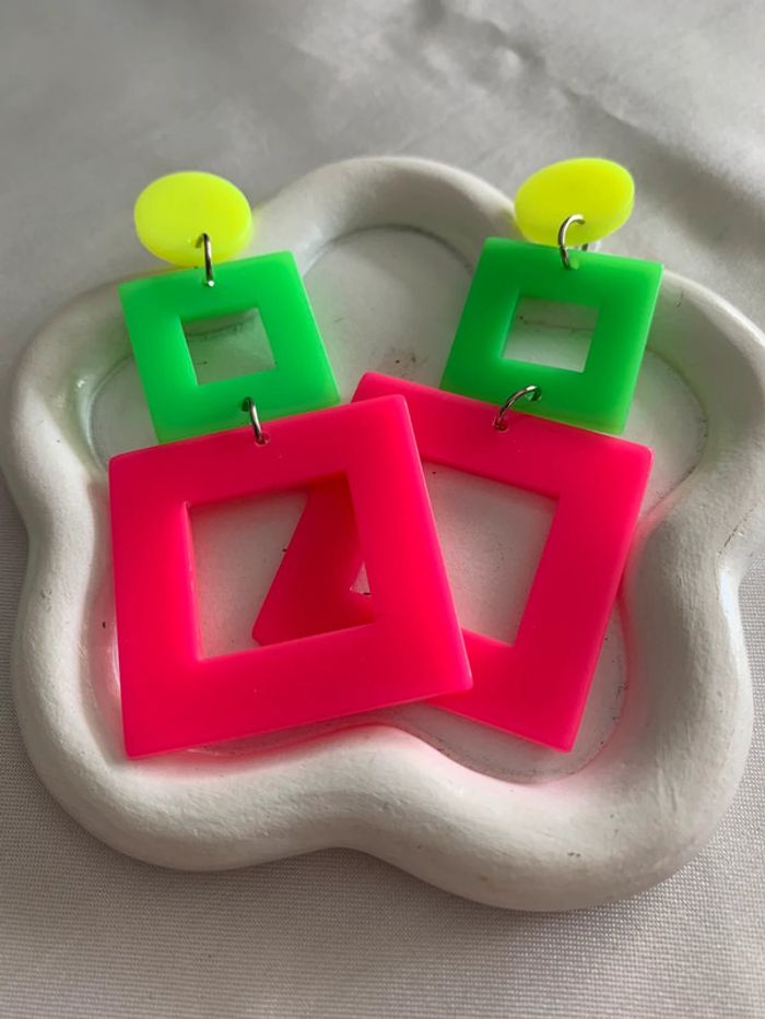 Boucles d’oreilles xxl carrées vertes roses et jaunes fluo années 80 - photo numéro 1