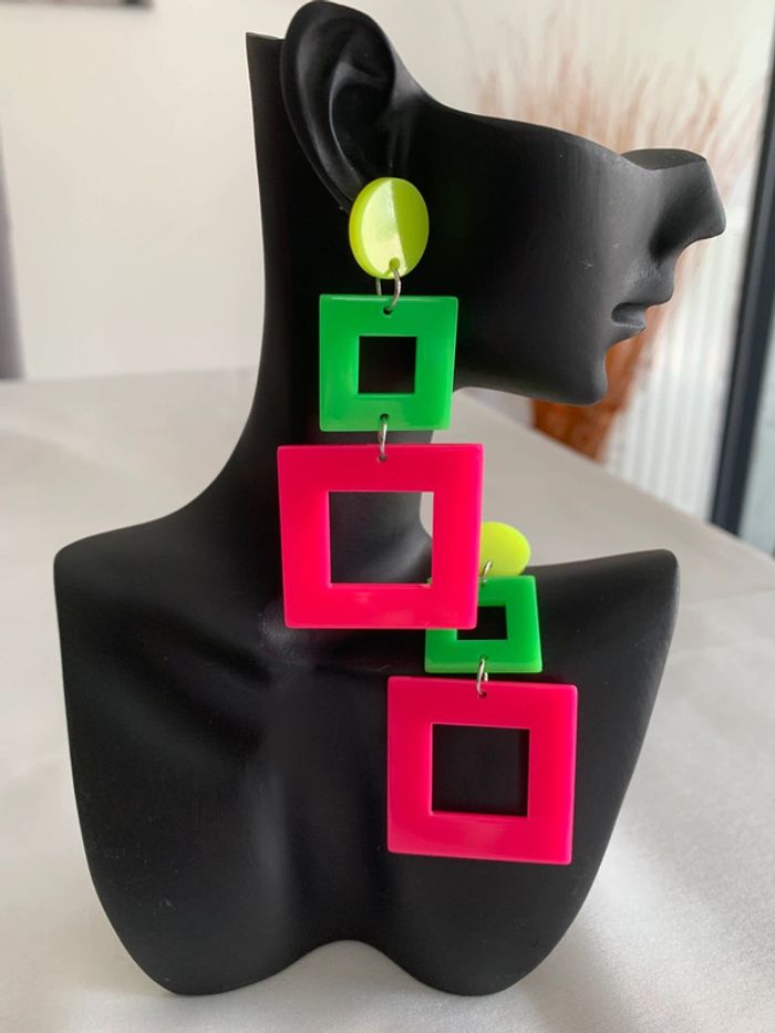 Boucles d’oreilles xxl carrées vertes roses et jaunes fluo années 80 - photo numéro 6