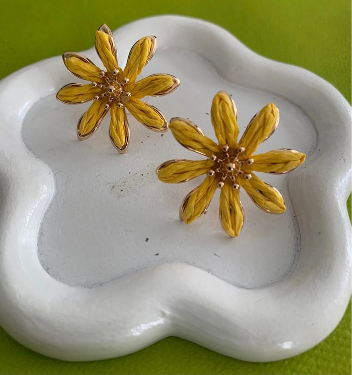 Boucles d’oreilles fleur jaune et dorée en raphia - photo numéro 3