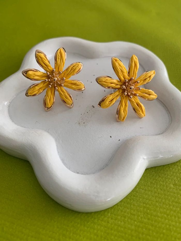 Boucles d’oreilles fleur jaune et dorée en raphia