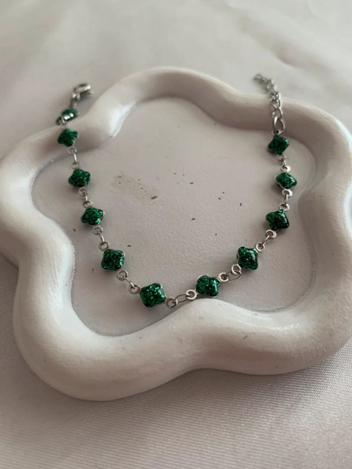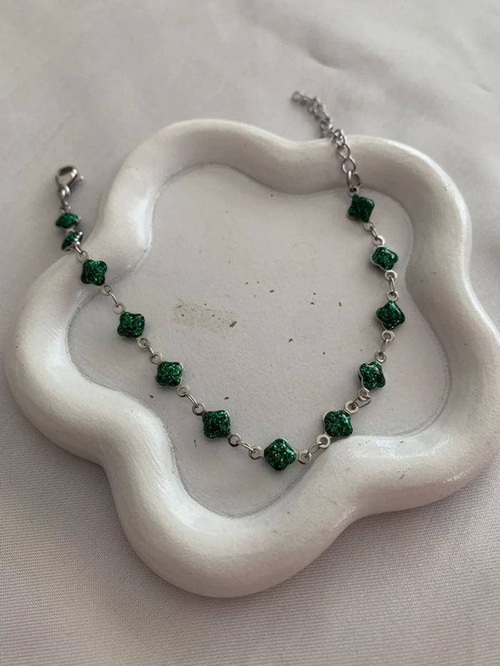 Bracelet trèfle vert à quatre feuilles en acier inoxydable argenté
