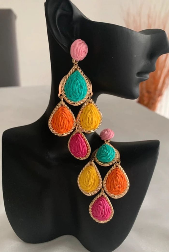 Boucles d’oreilles xxl gouttes d’eau multicolores en raphia - photo numéro 6