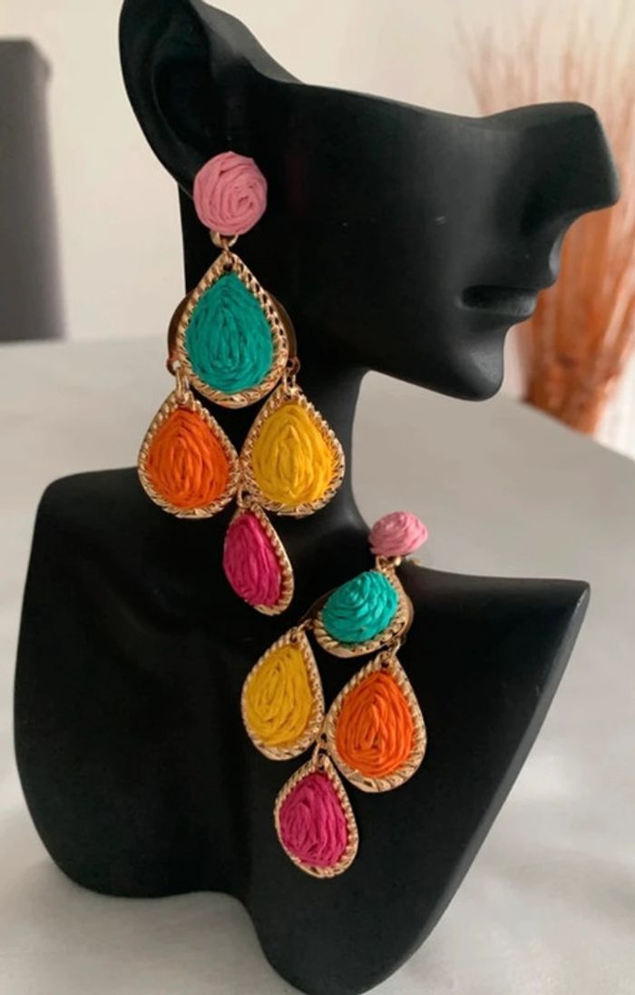 Boucles d’oreilles xxl gouttes d’eau multicolores en raphia - photo numéro 2