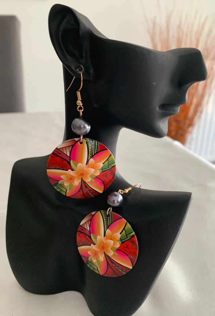 Boucles d’oreilles fleur ronde multicolore et perle grise - photo numéro 4