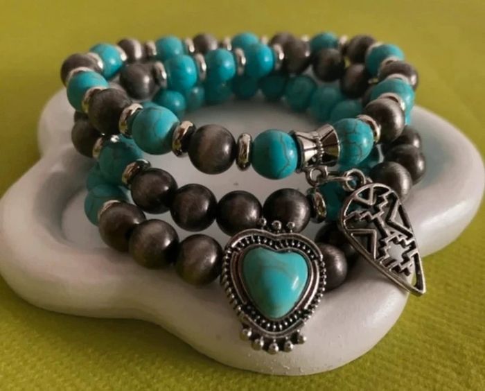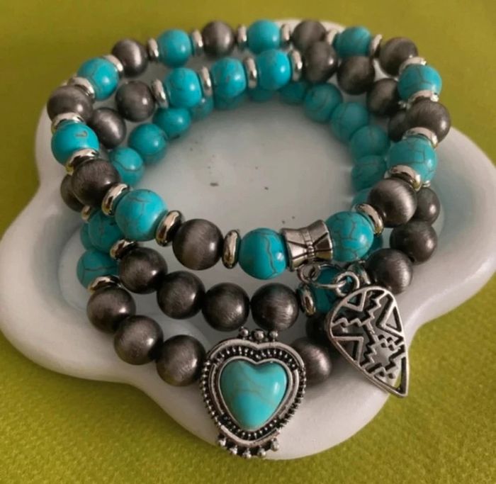 Bracelets de perles grises et bleues turquoises avec breloques en lot de 3 - photo numéro 1