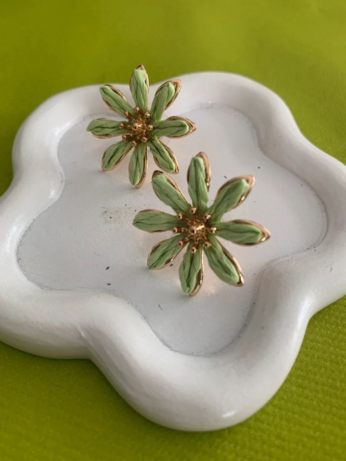 Boucles d’oreilles fleur verte et dorée en raphia - photo numéro 2