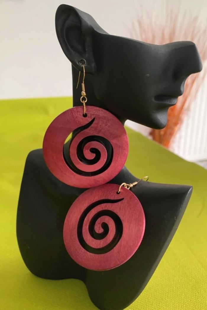 Grandes boucles d’oreilles xxl spirale bordeaux ronde en bois - photo numéro 1