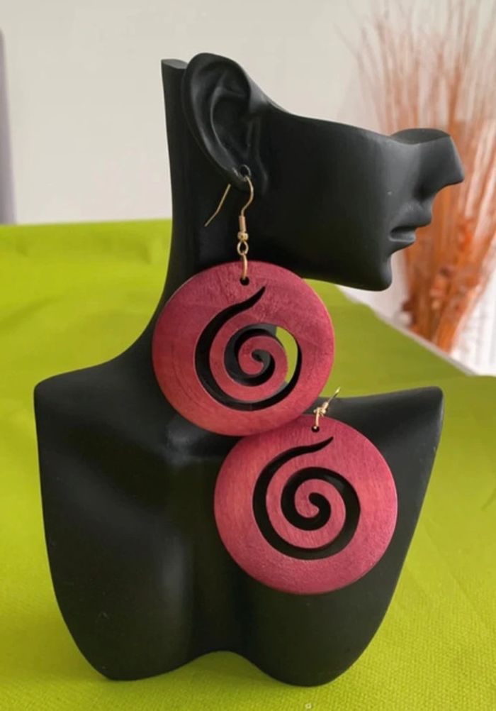 Grandes boucles d’oreilles xxl spirale bordeaux ronde en bois - photo numéro 6