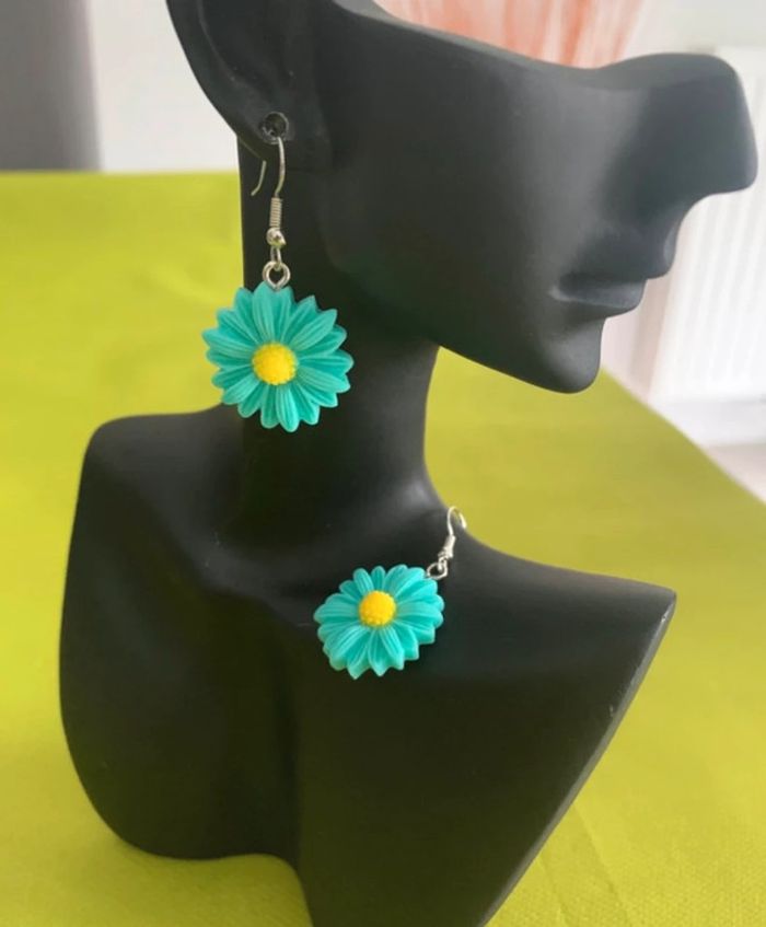 Boucles d’oreilles fleur marguerite bleue verte turquoise - photo numéro 4
