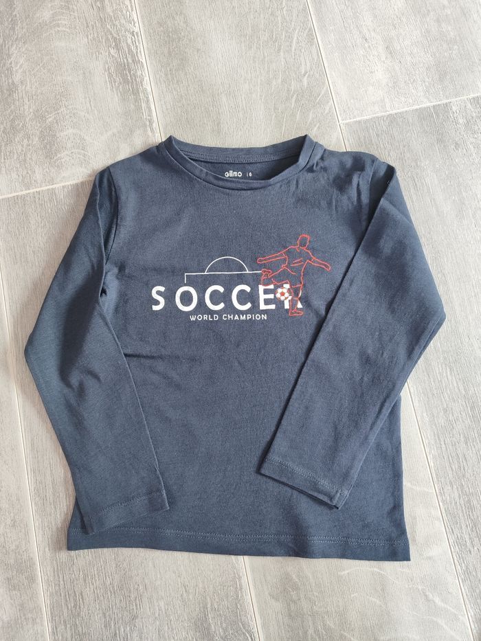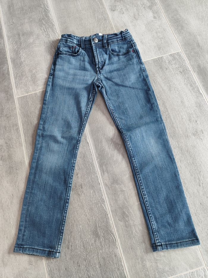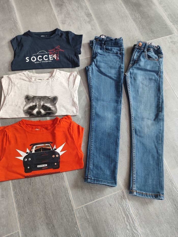 Lot de vêtements en 6 ans comprenant 3 t-shirts manches longues comme neuf et 2 jeans slim très bon état juste le dernier jean l étiquette craquelé mais rien de méchant, voir la dernière photo de marque okaidi, gemo