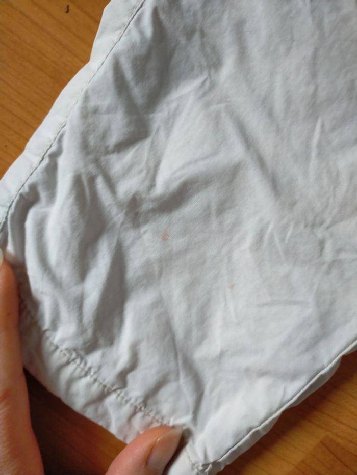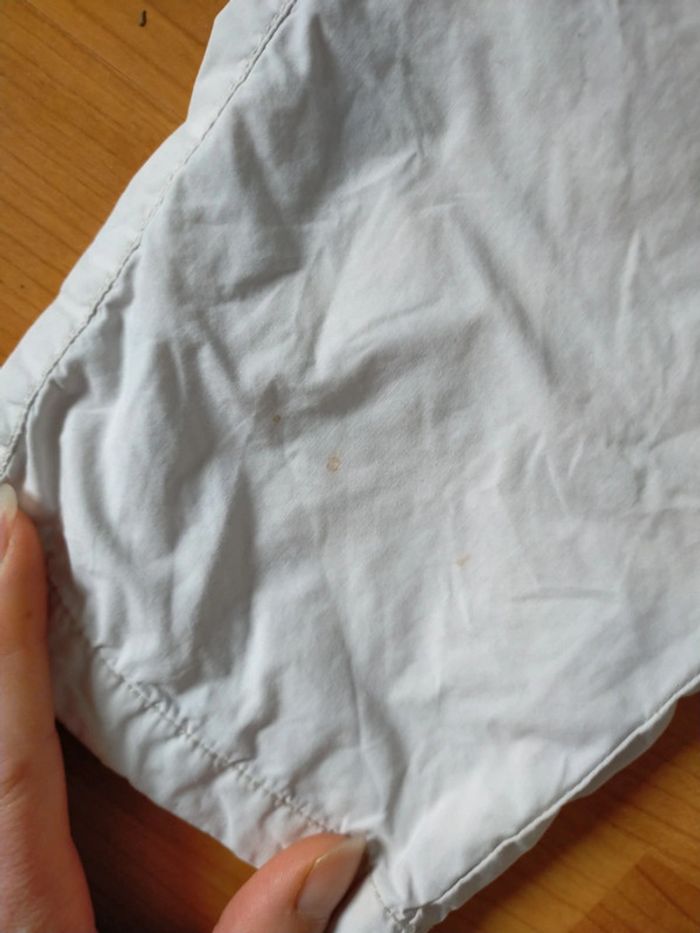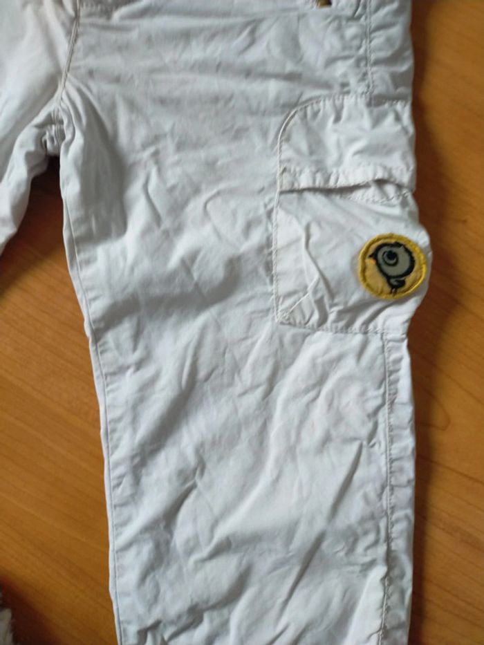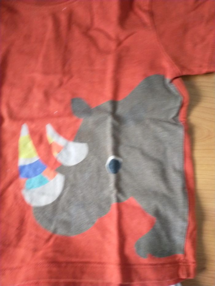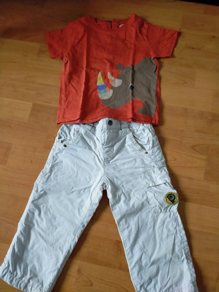 Pantalon couleur crème, qq taches discrètes en bas de jambe, voir photo T-shirt manches courtes orange coloré motif rhinocéros