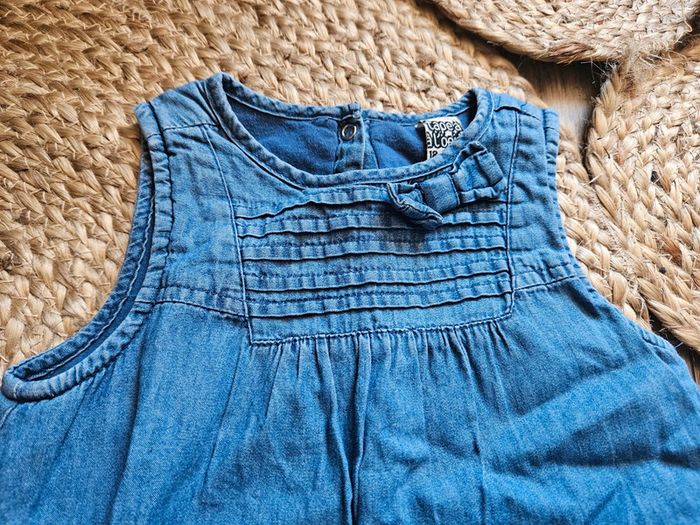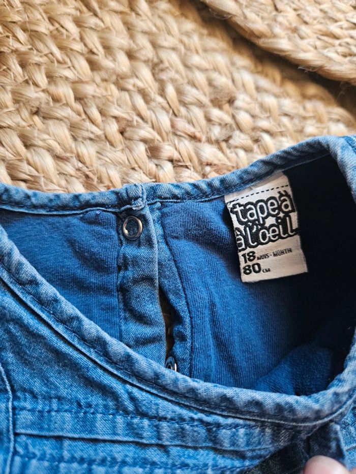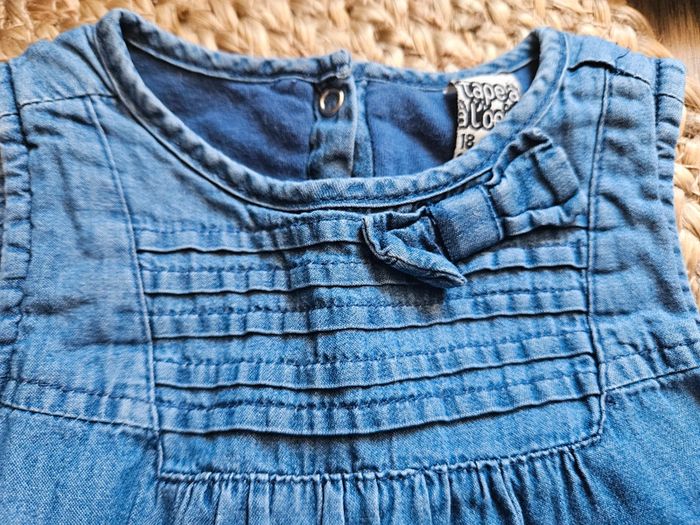 Jolie petite robe bleue de chez Tape à l'oeil. Petit noeud en haut à gauche. Fermeture à l'arrière par 3 pressions. Très bon état #flagadajonesfille18mois #robe18mois #robetao18mois #robetapealoeil18mois Crose